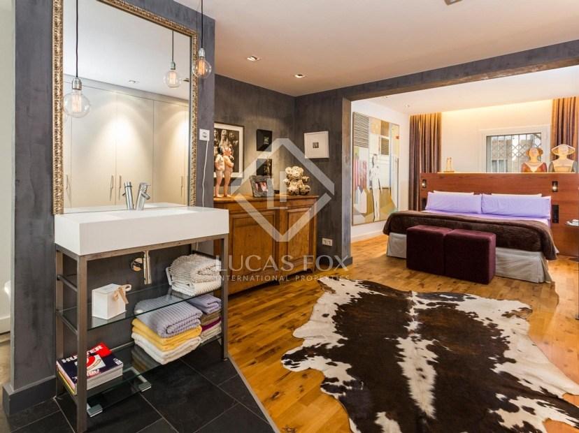 En los dormitorios sorprende de nuevo la ausencia de tabiques entre habitación y cuarto de baño. La separación de ambientes se resuelve de forma sencilla con un cambio de revestimientos, tanto en suelo como en paredes. La iluminación vintage en el cuarto de baño del dormitorio principal es sencillamente exquisita.