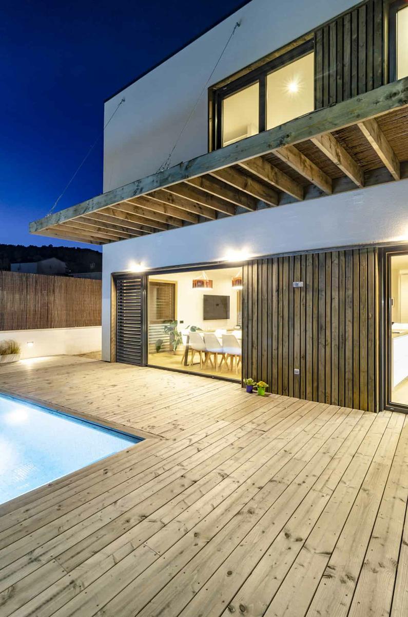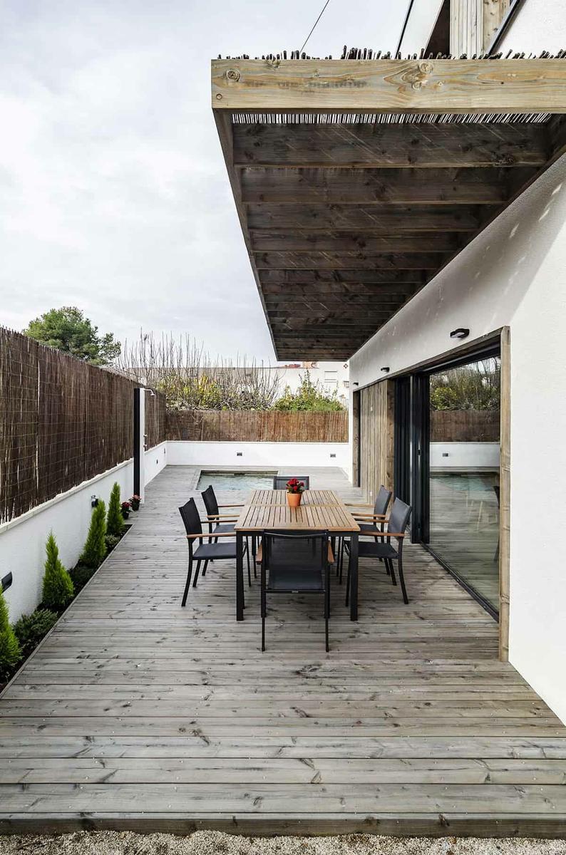 Fuente: arquima Para exteriores y fachada se ha optado por utilizar madera Dougles sin albura, que no necesita mantenimiento y le confiere a la casa resistencia y durabilidad.