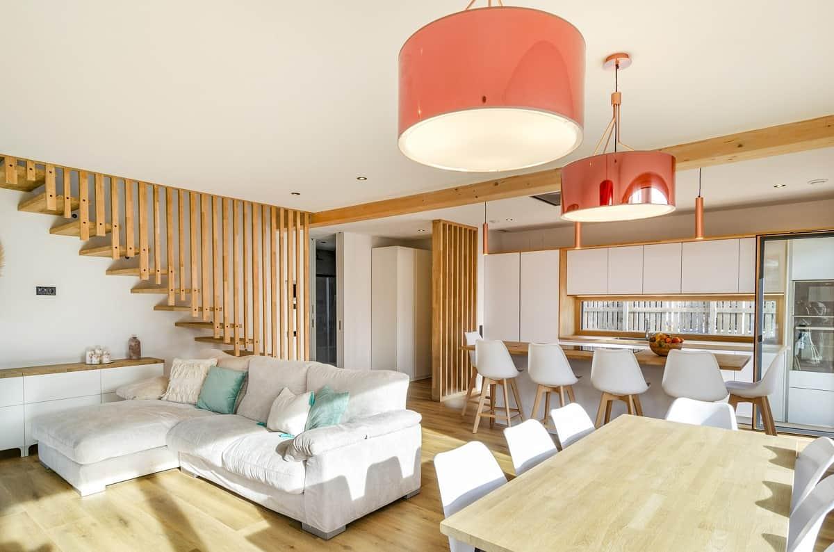 Fuente: arquima La decoración interior con paredes blancas y el pavimento de madera le confiere un ambiente cálido y natural a la vivienda. La cocina funcional y con isla central tienen los electrodomésticos integrados.