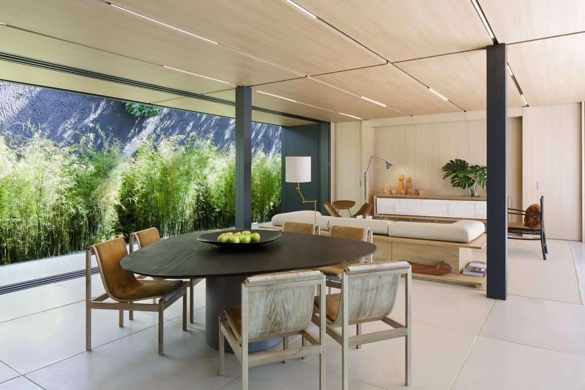 Fuente: pinterest La casa se distribuye en una sola planta. Los paramentes exteriores son de composite de aluminio, en cambio los interiores son de madera. La construcción se sustentas sobre un sistema de vigas y pilares que dan lugar a distintas configuraciones. El diseño y la obra solo se han tardado solo 6 meses.