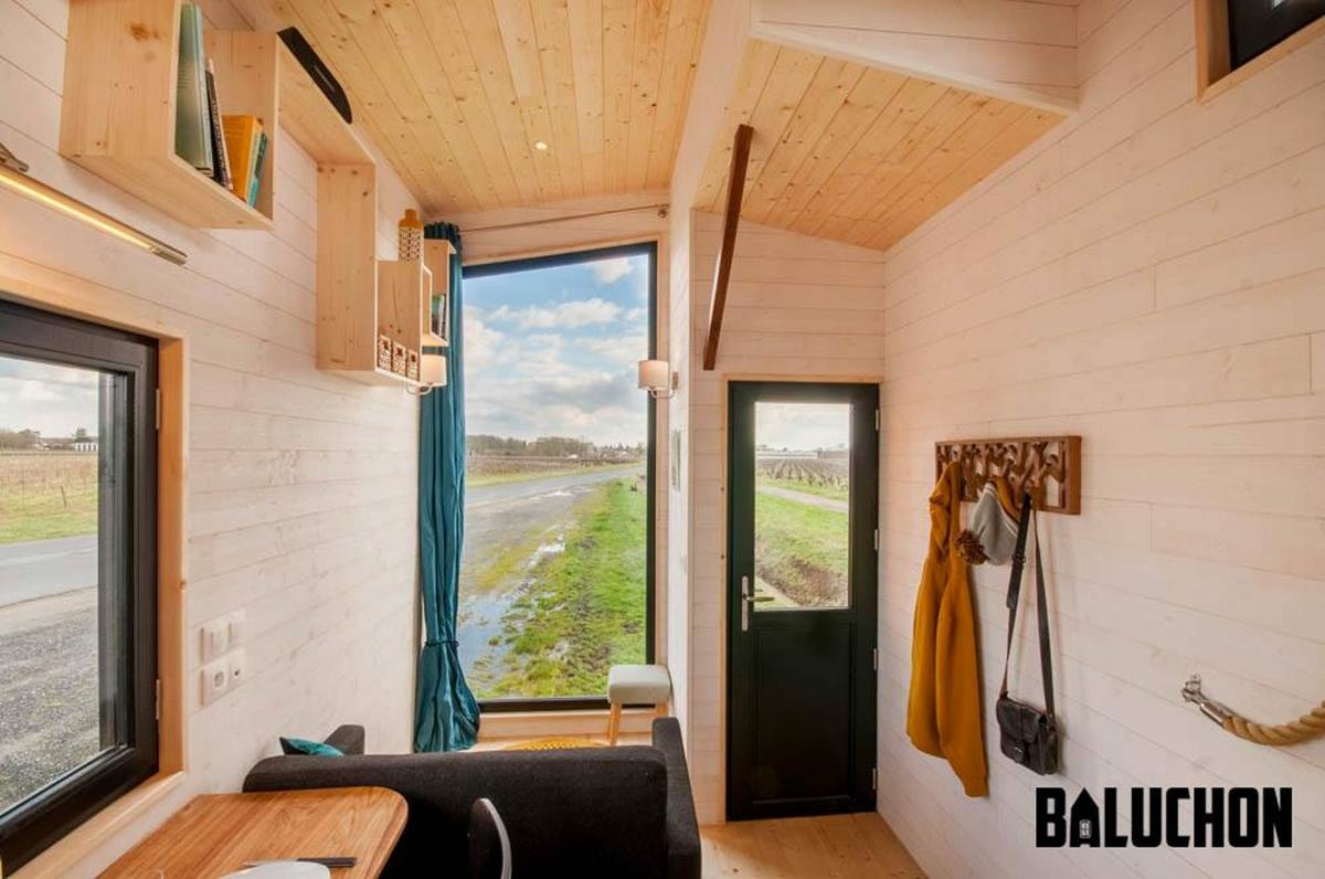 Fuente: tinyhouse-baluchon En la sala de estar cuenta con un gran ventanal de 2.70 m de altura para iluminar el interior de la minicasa y de crear un efecto increíble exterior-interior.