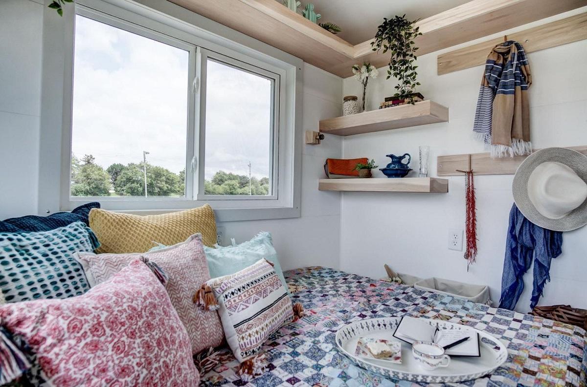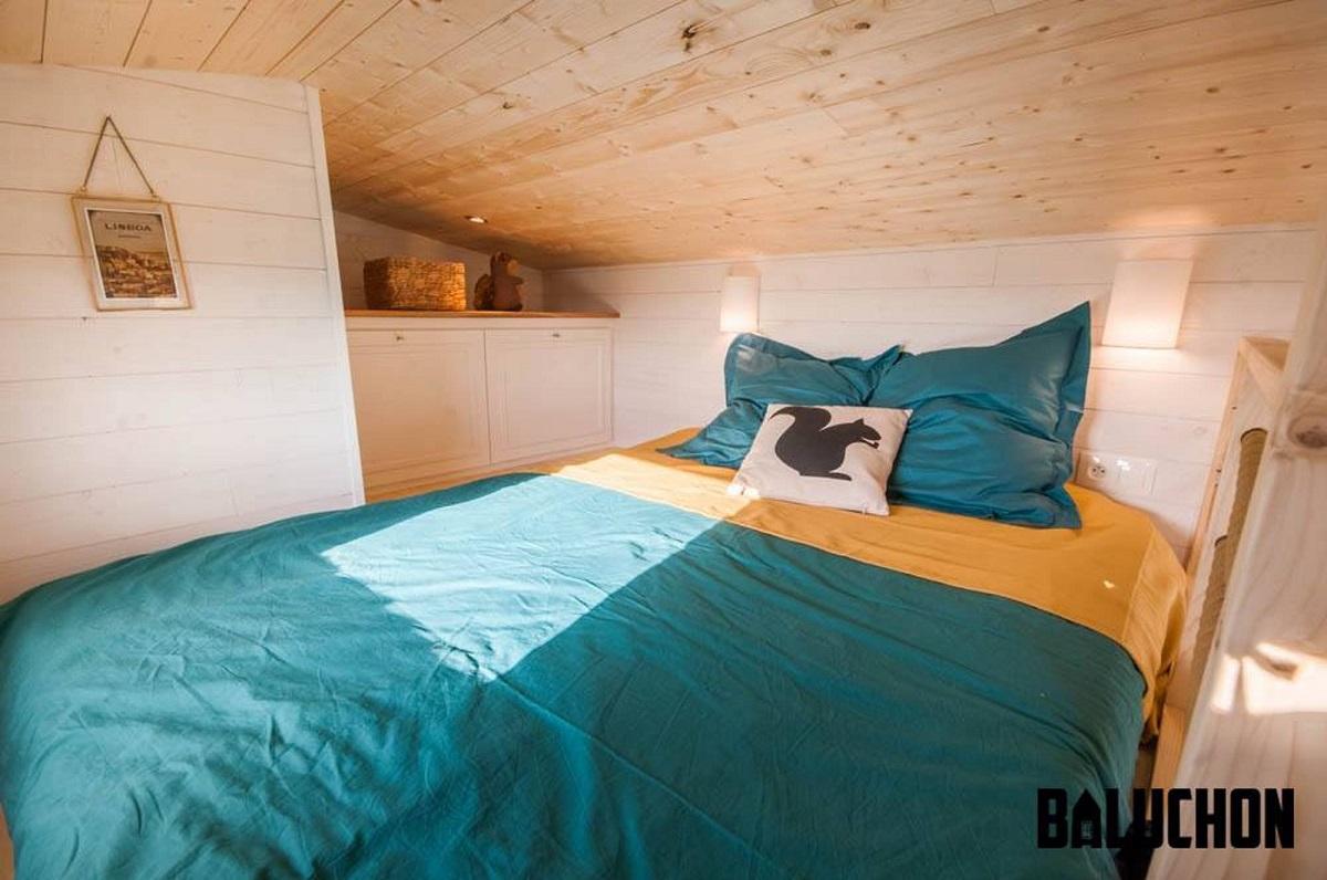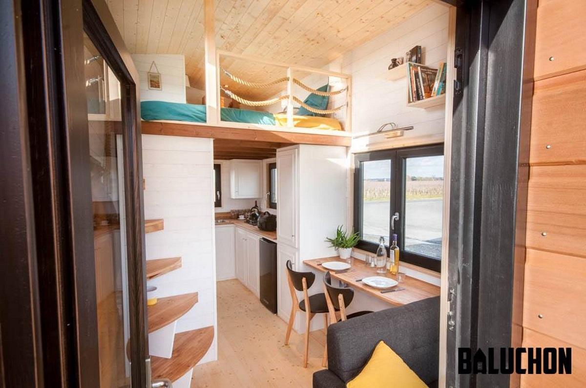 Fuente: tinyhouse-baluchon Esta casa remolque es ideal para parejas jóvenes. Cuenta con muchos ventanales, sofá, mesa de comedor para dos, cocina y baño completo. Además cuenta con un dormitorio con cama de matrimonio y armarios. Cuenta con una iluminación Led y conexión eléctrica estándar estilo RV. Una de las casas remolque de la empresa que puedes adquirir por 42.5000€.