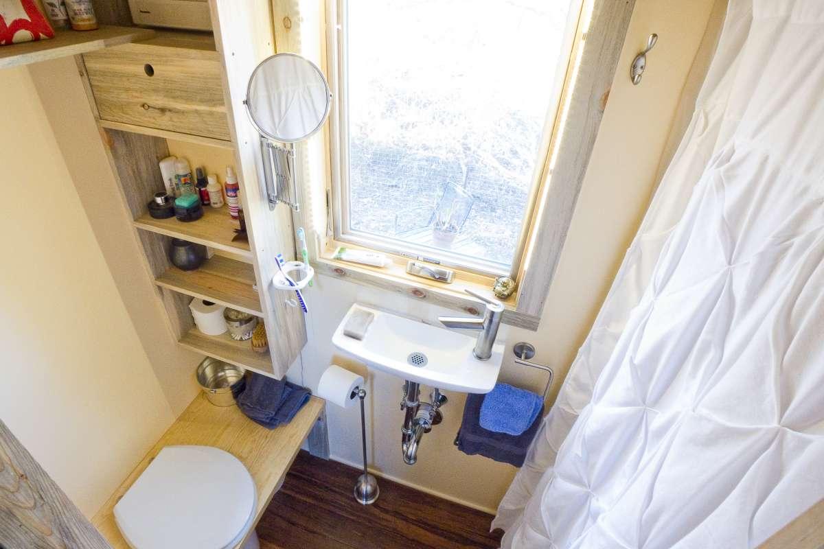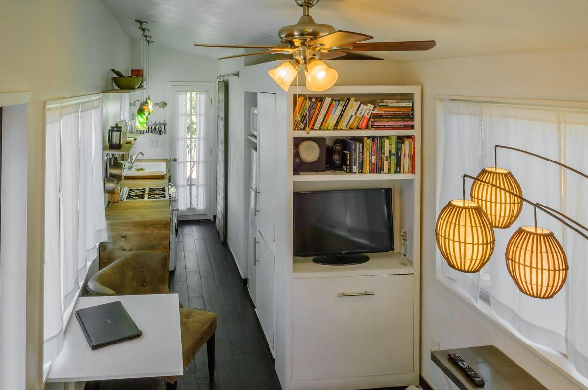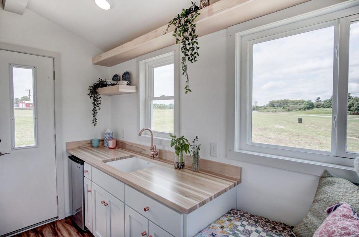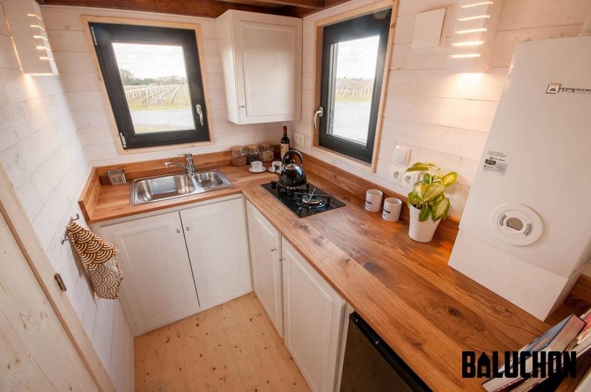 Fuente: pinterest Al entrar se encuentra una pequeña cocina con encimera de madera. Enfrente hay un reducido baño con ducha y al fondo la cama que actúa también de zona de estar. La minicasa cuenta con estantes en la parte superior que sirven de zona de almacenamiento. También debajo la cama existe un espacio de almacenamiento.