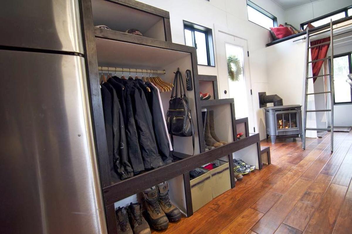 Fuente: pinterest La pareja estudió arquitectura y decidieron construir su nuevo hogar. La minicasa de madera cuenta zona de estar, dormitorio, cocina cuarto de baño. La casa esta pensada para sacarla el máximo partido. Debajo de las escaleras colocaron un armario para la ropa. Forma parte de las casas remolque sorprendente por su sencillez y funcionalidad.