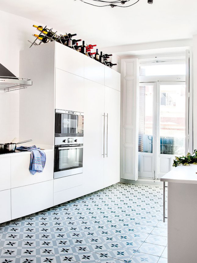 Me encanta la cocina, con muebles completamente blancos dejando el protagonismo al suelo hidráulico, y el toque moderno y desenfadado de la lámpara de techo, como si hubieran hecho un lio de cables y puesto ahí de cualquier manera,