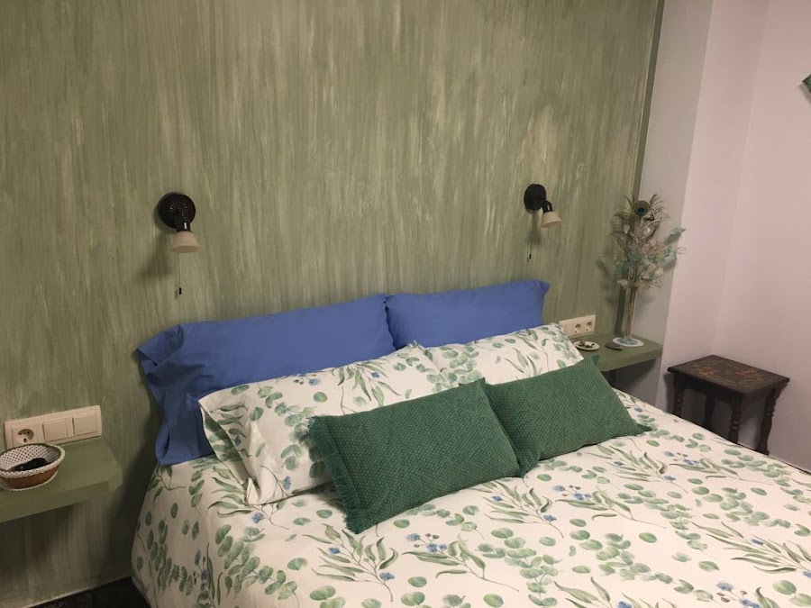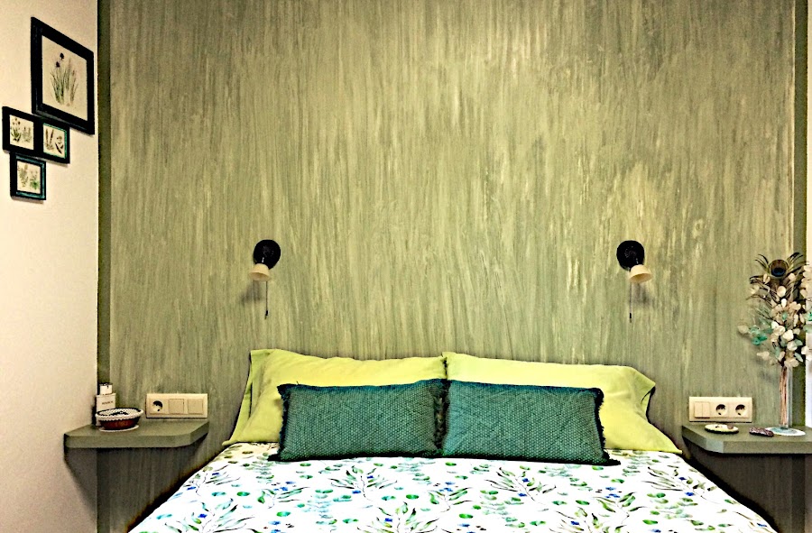 La pared se ha pintado en color verde suave, dando una textura y apariencia de madera.