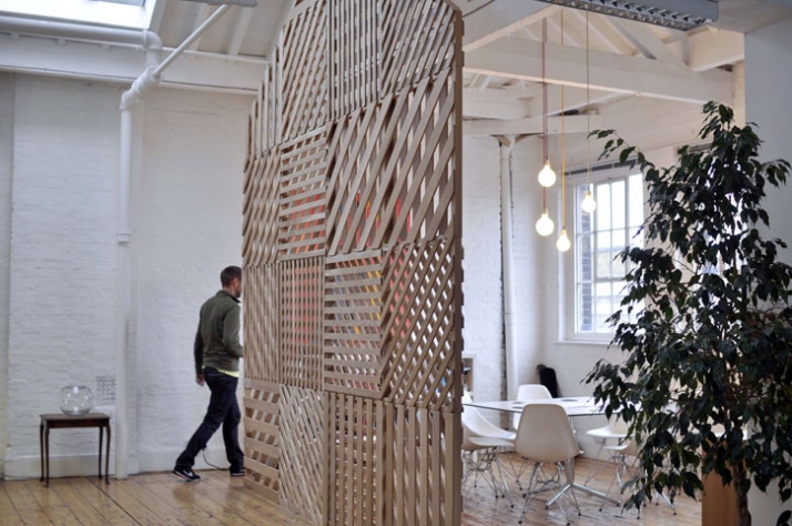 Un separador de espacios realizado con una combinación de celosías de madera.