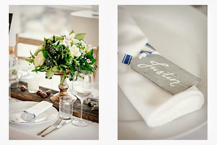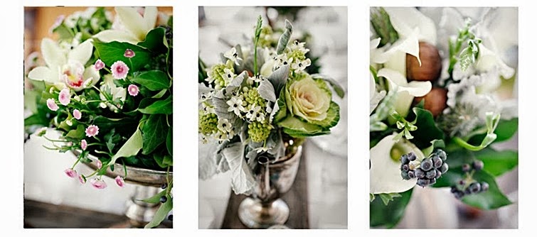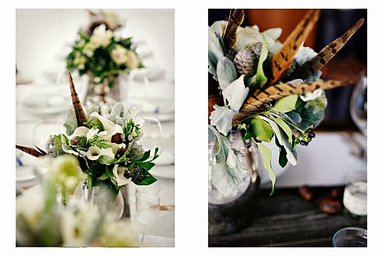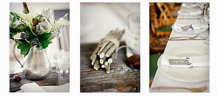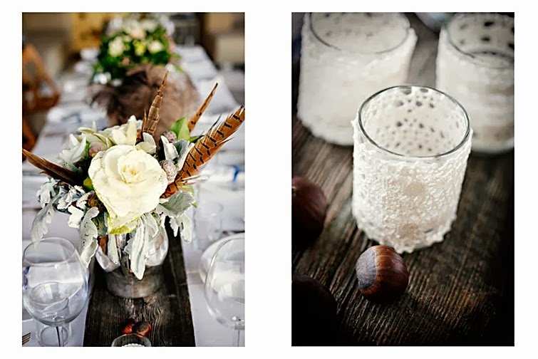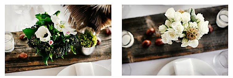 En la web Sunday Suppers, nos muestran cómo montar una mesa preciosa vestida de otoño. De base usamos mantel, servilletas y vajilla en tonos blancos, y cristalería sencilla, dejando todo el protagonismo al resto de elementos. Cogemos un buen tablón de madera, como si fuese el camino de mesa, y sobre él disponemos la decoración floral en una combinación genial de plumas y flores. Nos parece muy original el toque de las jarras y teteras vintage de zinc llenas de calas, anémonas, frutos silvestres, hojas, y bonitas plumas. Lo completamos con unas castañas sueltas (ñam-ñam... No es estupendo que el atrezzo se coma?), manojos de ramitas atados con hilo y portavelas cubiertos de ganchillo con velas tealight.