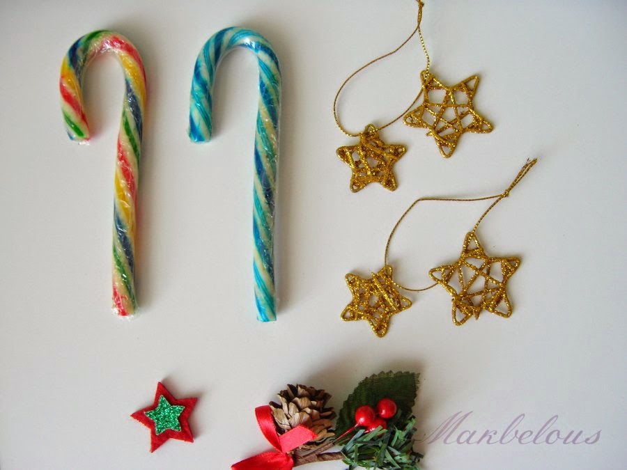 unos bastones de caramelo y unos pequeños adornos de los que vienen en los envoltorios de los regalos de las navidades pasadas