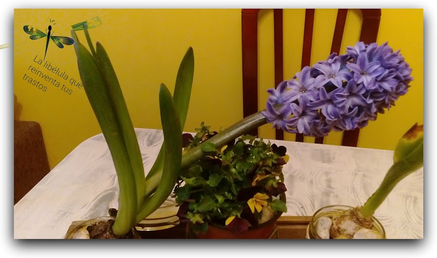 Dejé las plantas provisionalmente en el comedor, que reciben mas luz, y a los pocos días esto fue lo que me encontré: un jacinto se había abierto y el tallo no podía con su peso!!!