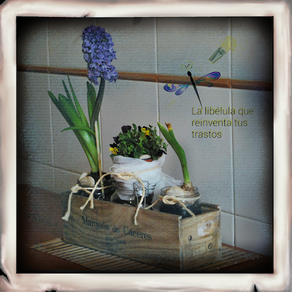 Simplemente relleno los botes de piedras decorativas, meto los bulbos, y los lleno de agua (excepto la viola que va con el tiesto). y para adornar una rústica cuerda.