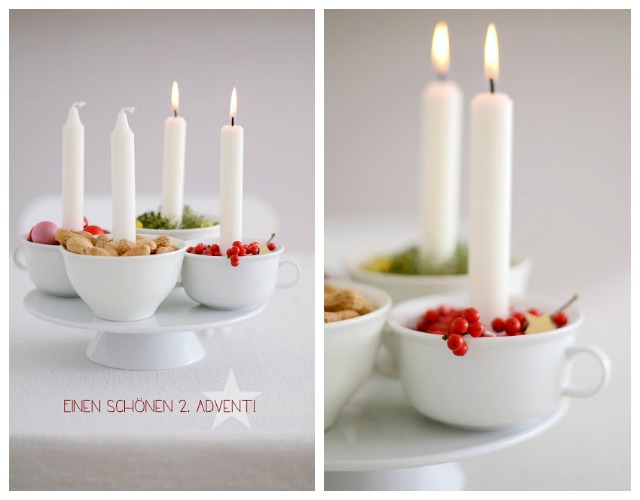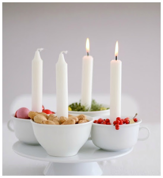 Tan sólo necesitamos colocar una vela en el interior de la taza y llenar cada una de ellas de diferentes elementos, en una musgo, en otra cacahuetes, en otra frutos rojos del bosque.........más lowcost imposible.