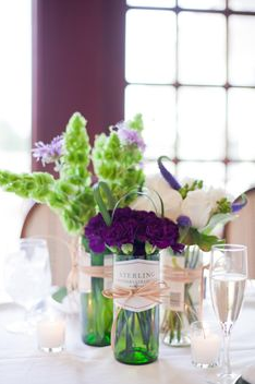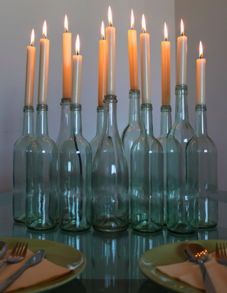 Con botellas, podremos hacer unos centros de mesa espectaculares tanto de candelabros, colocando velas en el cuello de la botella como con flores a modo de jarrones.