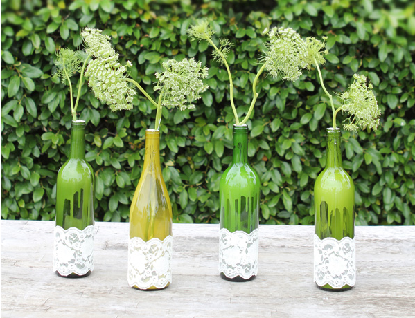Otra variante seria pegando tiras de encaje o lazos a las botellas.