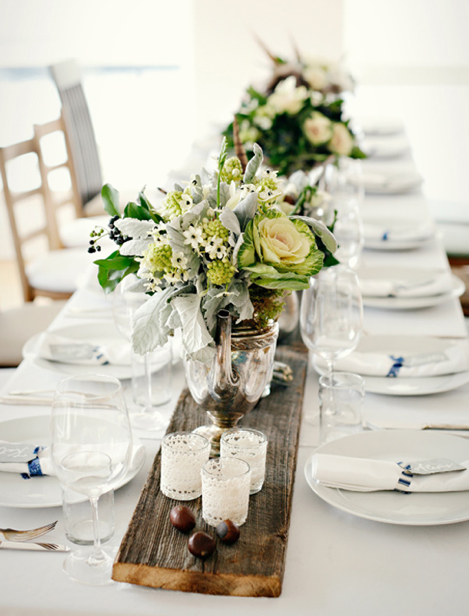 Finalmente, para quién no quiera renunciar a poner ese toque rústico en la mesa porque no consiga las rodajas de troncos de madera, un tablón haciendo de camino de mesa servirá igualmente.
