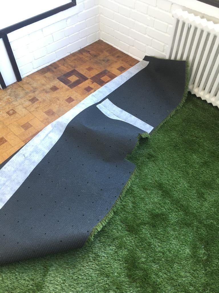 Para colocar las juntas hay que utilizar una cinta que también viene con el producto. Primero lo pegas por un lado a una de las piezas de césped que quieres unir.