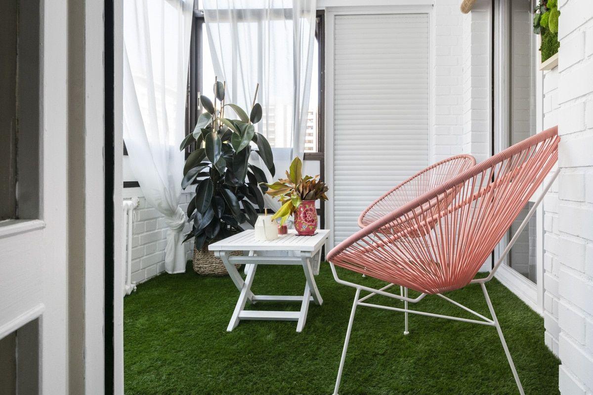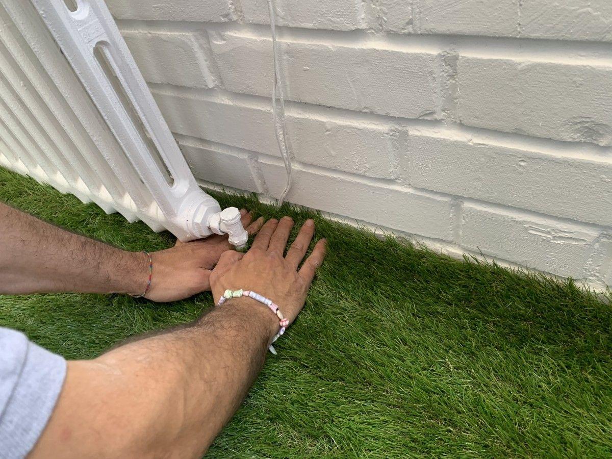 Solo ya con las paredes y el radiador blancos esta terraza cambió mucho. Pero la propietaria quería darle un toque más acogedor con césped artificial.