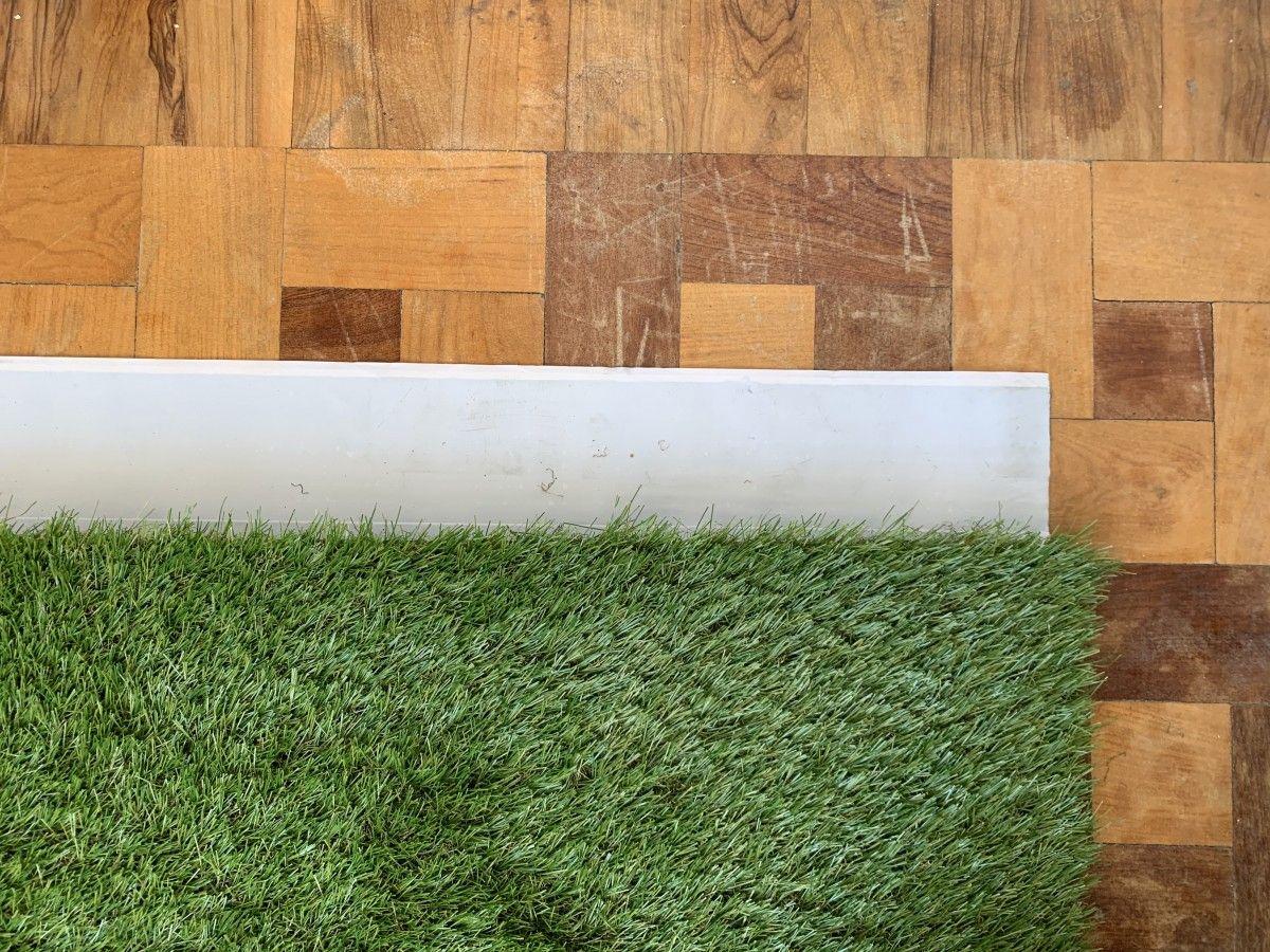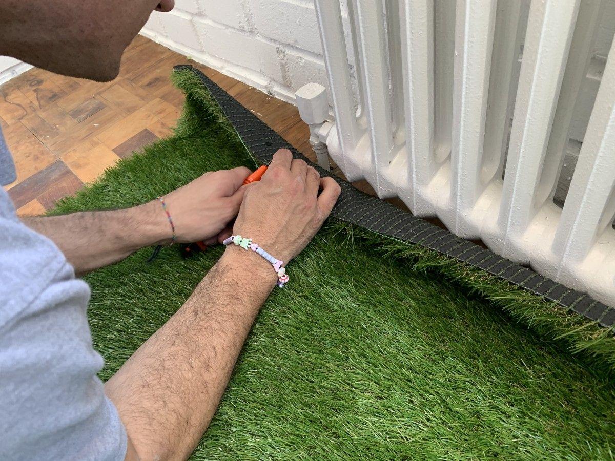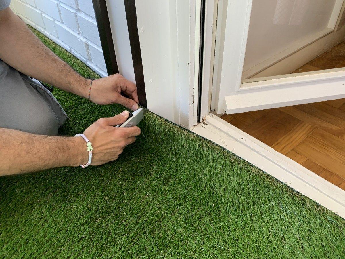 Lleva el césped hasta el primer extremo y con un cúter, haz los cortes necesarios para que se adapte a las formas del espacio. Si te suelo es completamente liso, sin radiadores, ni cambios de dirección en el zócalo, no tendrás que hacer este paso.