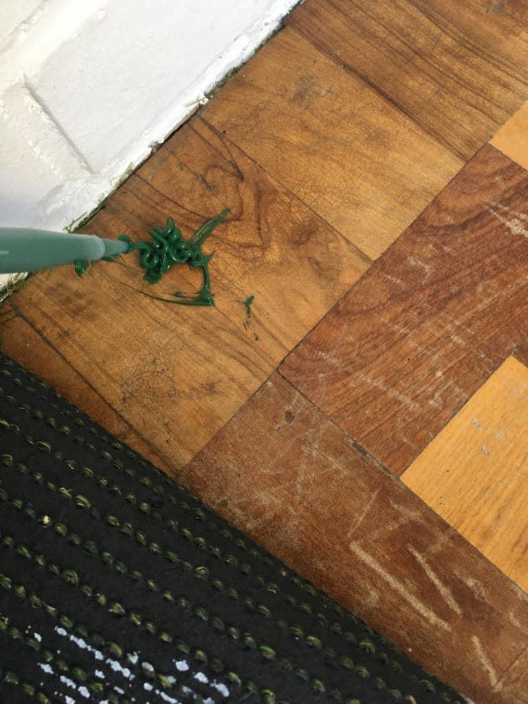 Cuando tengas el borde perfectamente ajustado a la forma de tu espacio, utiliza el adhesivo que viene con el pack para pegarlo al suelo.