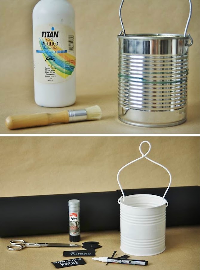 a la cesta, escritas con rotulador de tiza líquida y pegado sobre la lata,