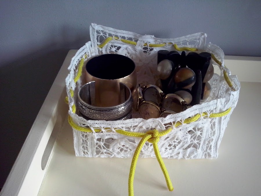 Se me ocurren multitud de cosas que se pueden realizar entre ellas, tiestos para plantitas (colocando en su interior uno de plástico o cerámica), joyeros, canastitas para el baño, para colocar infinidad de detalles, y además podemos usar los tonos que deseemos, si no encontramos el color que nos gusta, lo teñimos a nuestro antojo...