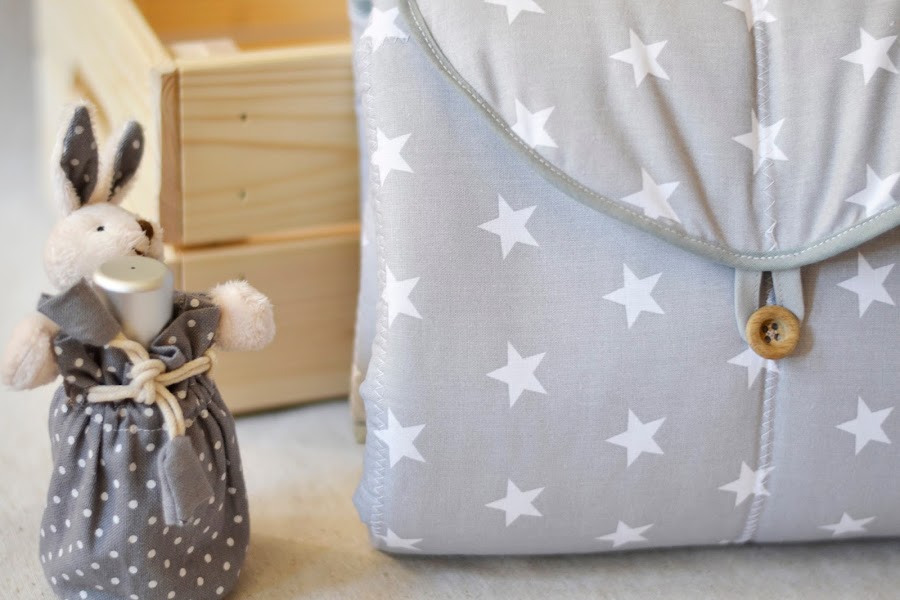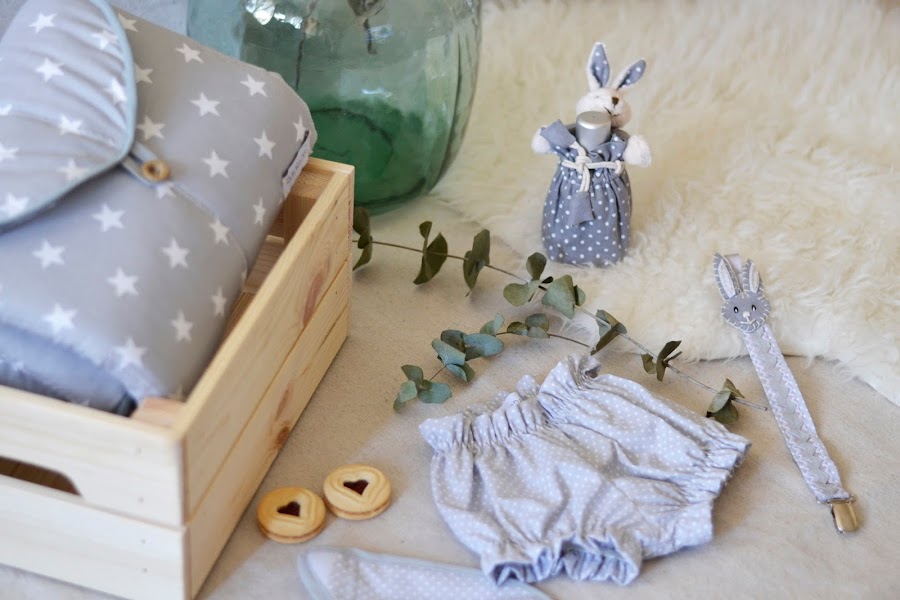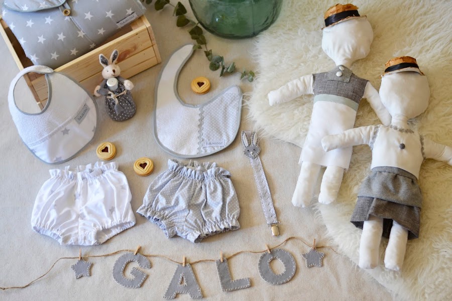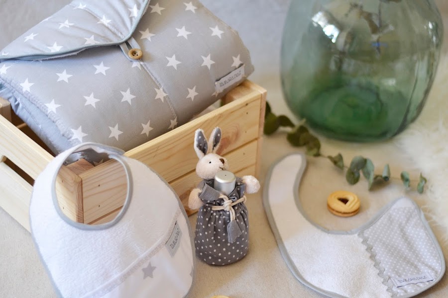 Se trata de una cesta regalo para bebé. En ella quise incluir diferentes cositas como: cubrepañales, baberos, cuelgachupetes, un cambiador de viaje, colonia, y una guirnalda personalizada para decorar la habitación del pequeño. Obviamente, cuando decides hacer algo así entran en juego la imaginación y la creatividad, por lo que los resultados pueden ser infinitos. Yo tenía muy claro la gama de colores que quería utilizar, los estampados, las telas y las pasamanerías, y juntándolo todo, el resultado es el que os enseño. Una buena idea para hacer un regalo diferente, único y especial porque lo hecho a mano y con cariño es el doble de bonito, ¿verdad?