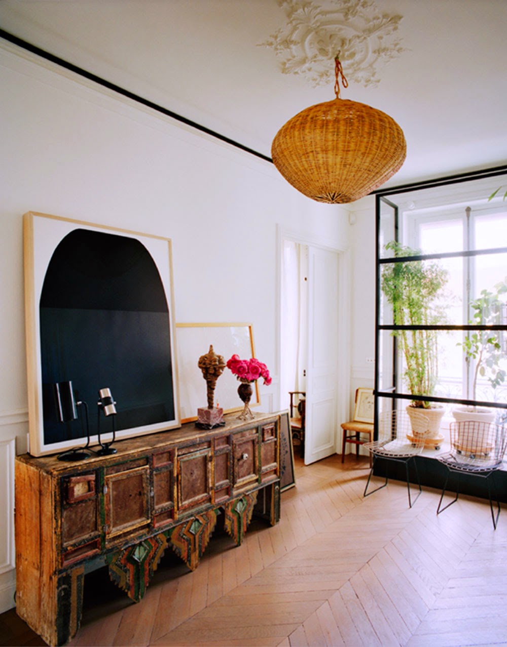Como veréis, sobre una base clásica, de suelos de madera en espiga, techos altos con molduras y paredes pintadas de tonos neutros y carpinterías blancas, se juega con mobiliario de diferentes épocas y culturas, arte y mucha creatividad.