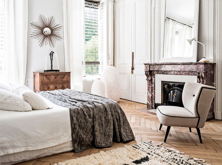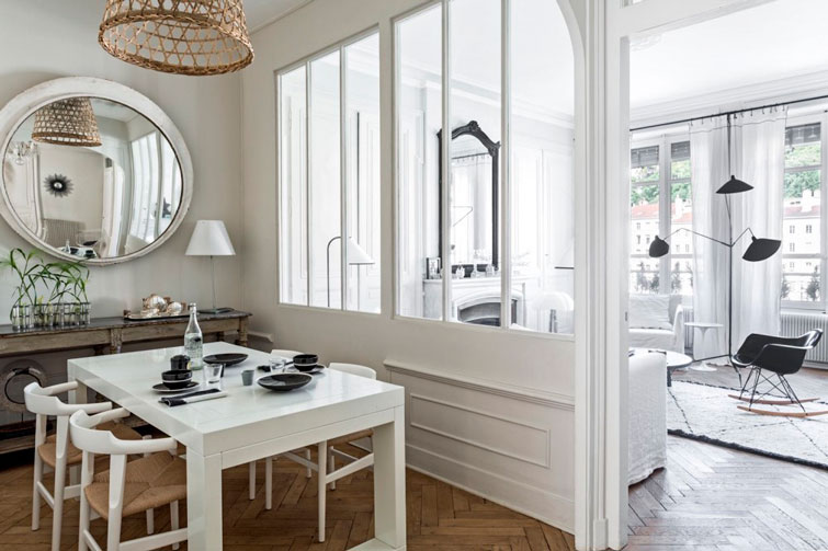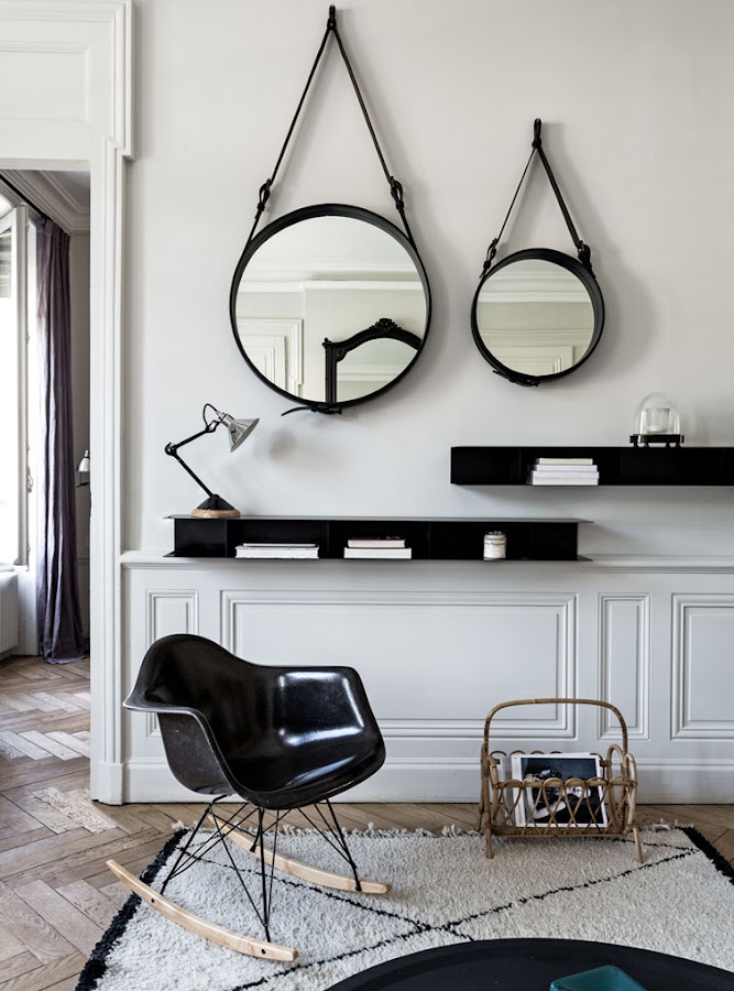 Más blanco y negro, pero con el típico toque de chic parisino. Una decoración completamente diferente a la vivienda unifamiliar de ayer, pero con ese punto de mezcla con arte que tanto me gusta. Elementos icónicos del diseño conviven en un ambiente clásico lleno de encanto.