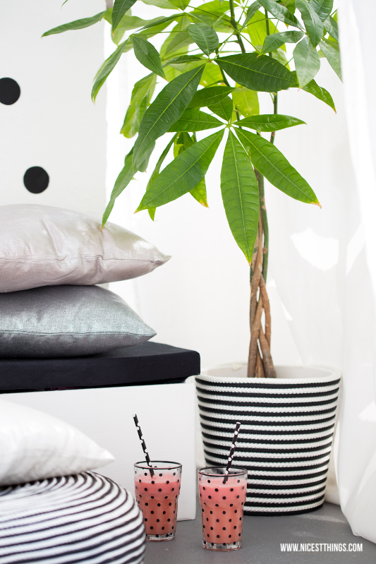 Si te animas a hacerlo, es el puff de minbre de Ikea y un macetero al que le han pegado cuerda en color blanco y nrgro, aunque también lo puedes hacer con un neumático o simplemente hacer una funda para el taburete y así tener la opción de tenerlo al natural o en blanco y negro.
