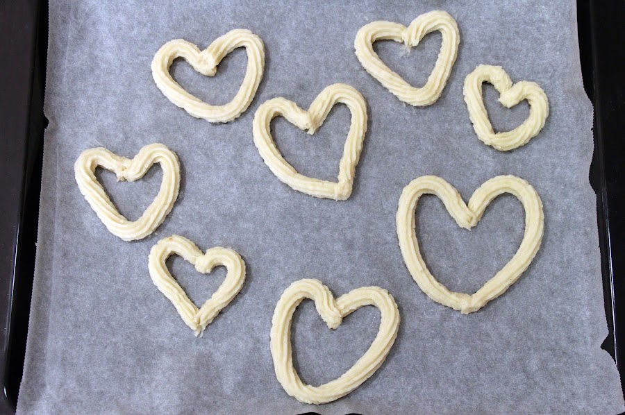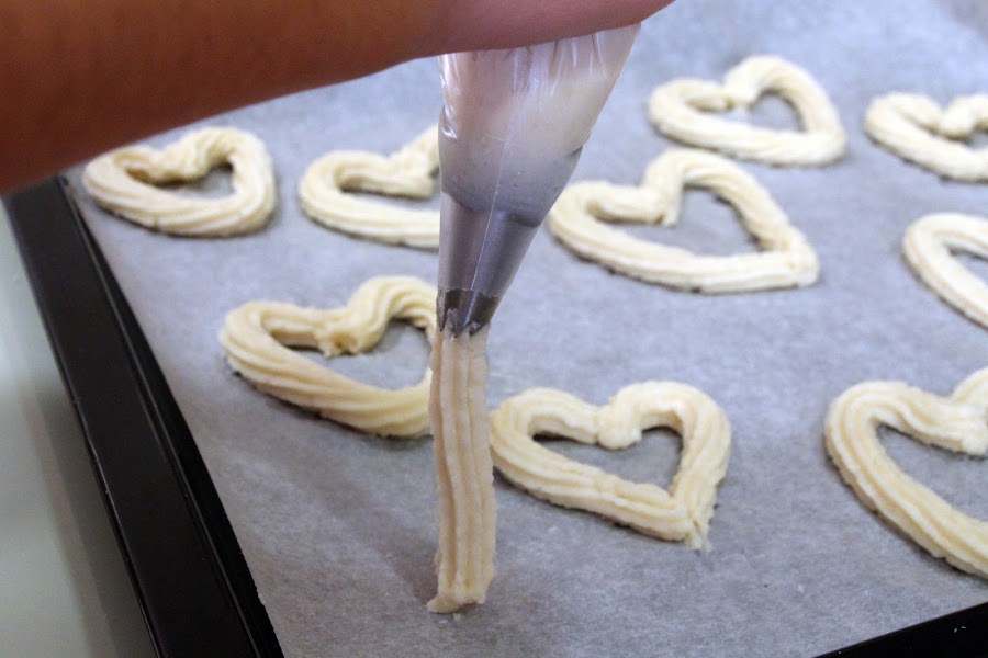 Con la manga pastelera hacer los churros haciendo forma de corazón encima de un papel sulfurizado.