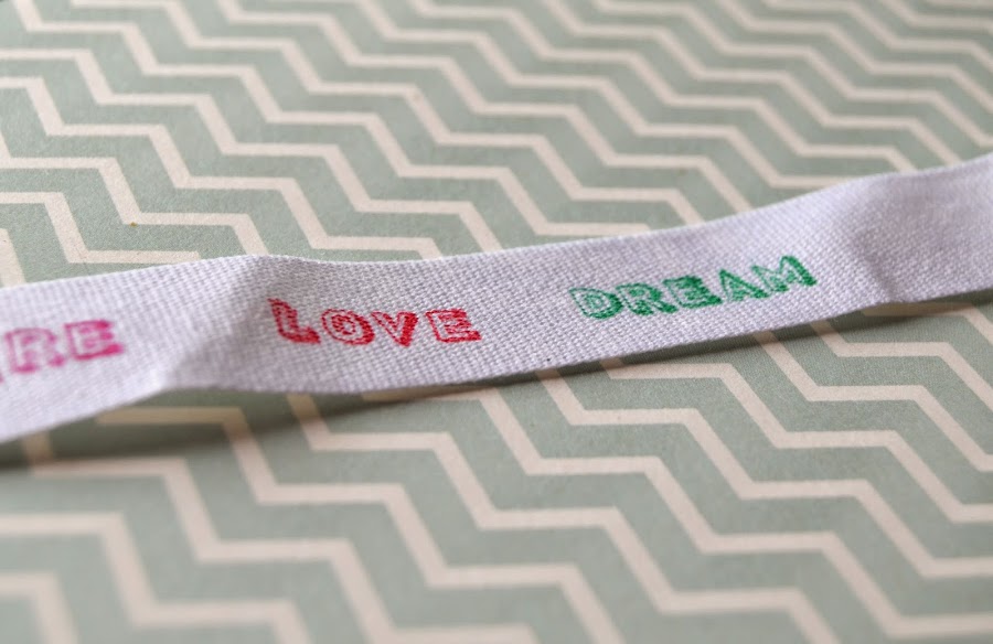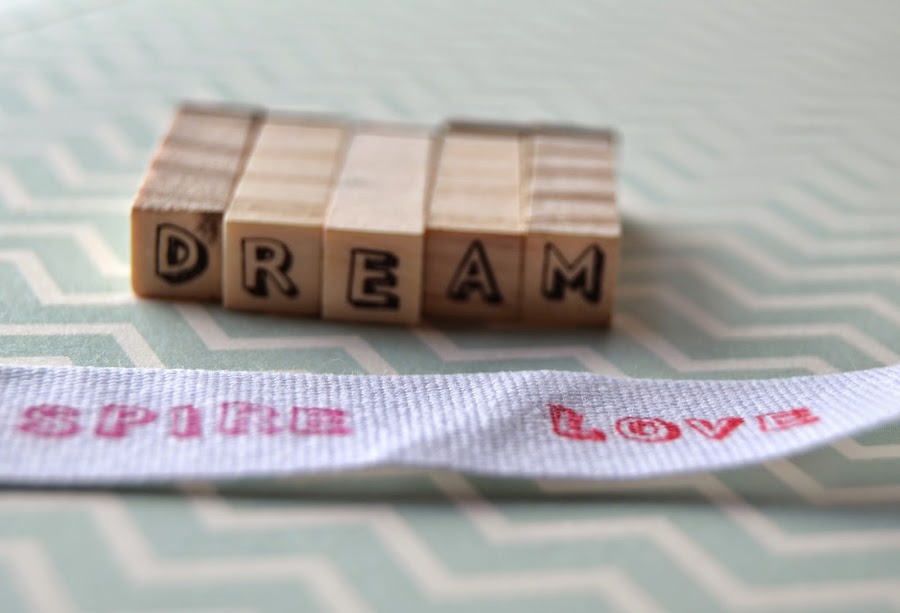Una vez estampadas las palabras o frases y la tinta está bien seca, fijamos planchando por detrás de la cinta. Y ya tenemos la cinta lista para usar. Yo he estampado las palabras INSPIRE, LOVE, DREAM.