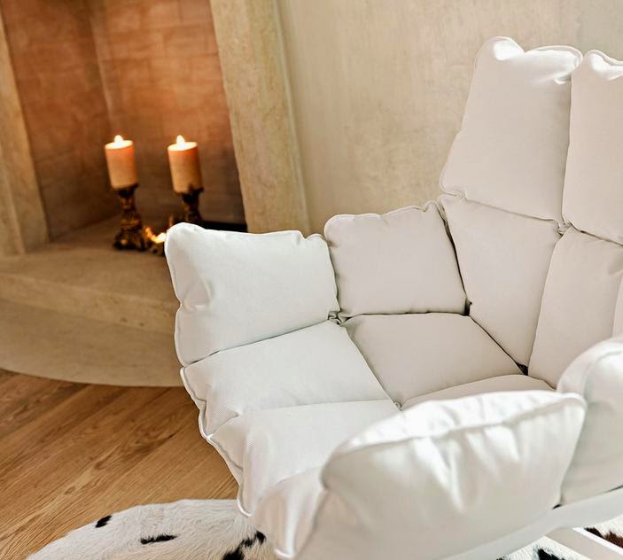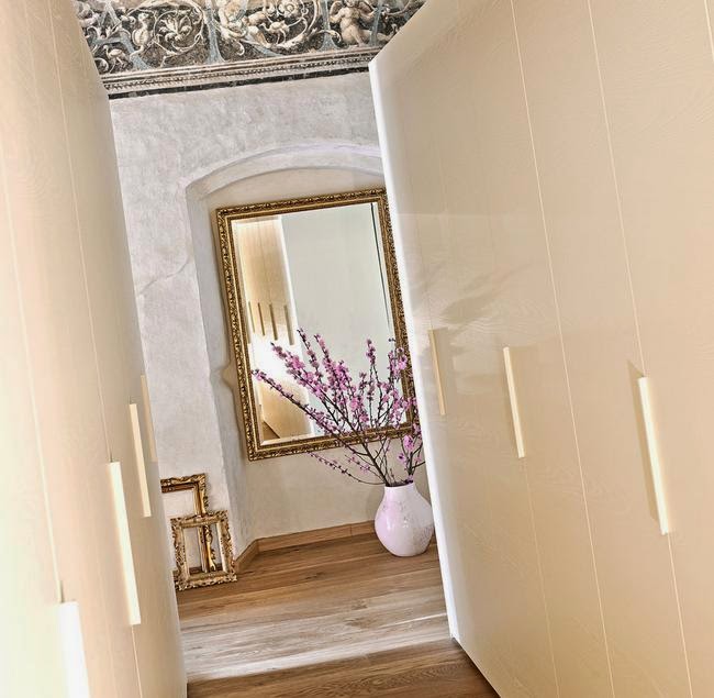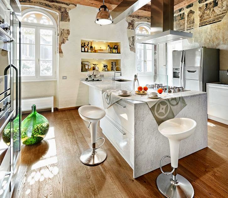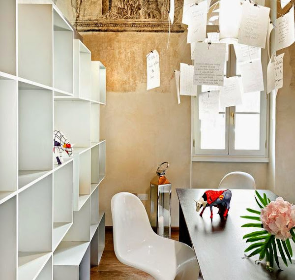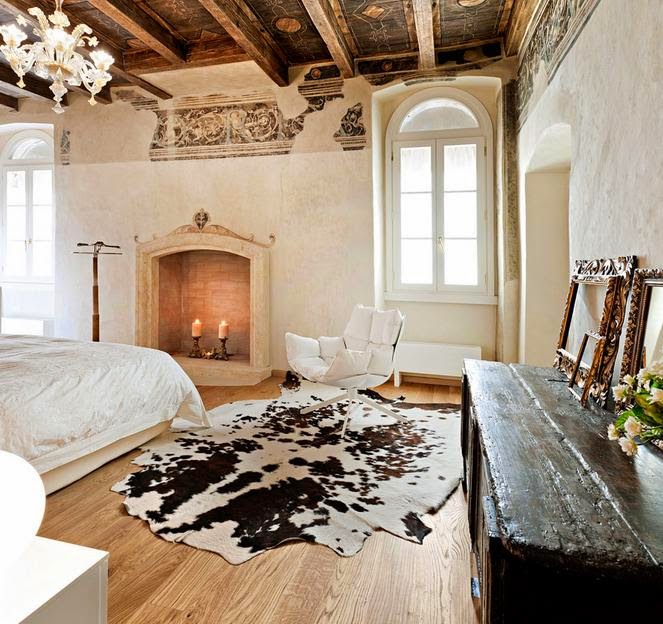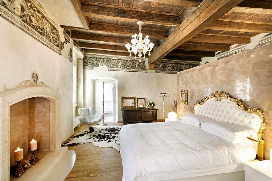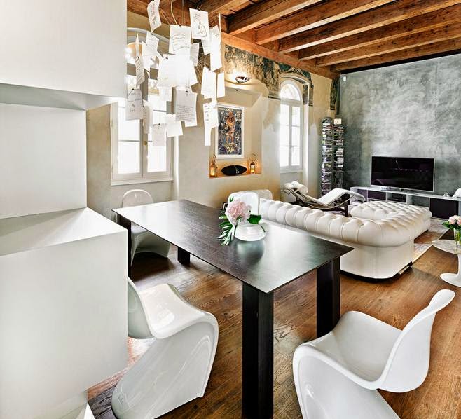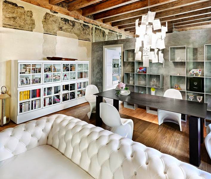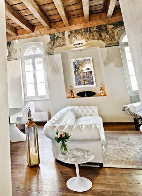 En la bonita villa que vamos a ver hoy, se da todo lo que os comenta anteriormente y mucho más. Como si de un palacio antiguo se tratara, se han mantenido el techo artesonado de madera y las paredes se han decorado con pinturas imitando a los frescos más clasicos. Un aspecto decadente que lo resfrescan las líneas rectas y los colores claros de los muebles.