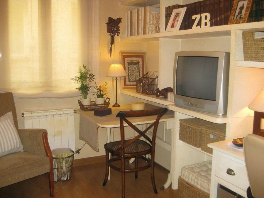 La propietaria nos comenta que la mayoría de los adornos proceden de Banak y de El Globo, dos de sus tiendas favoritas. Destacan en esta estancia las pinceladas de color verde que aparecen en el camino de mesa, en el plaid de Icíar de la Concha que descansa sobre la butaca y en los dos cuadros que visten la pared. No perdamos de vista el reloj de cuco y los archivadores forrados.