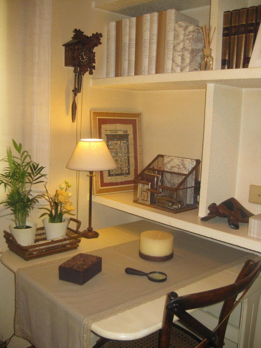 Los cuartos interiores, como esta sala que nuestra lectora emplea como despacho y cuarto de estar, requieren de una extrema pericia para ser aprovechados. Los muebles blancos y los tonos marrones que saltan de las cestas de mimbre a las patas de la butaca, y de ahí al material de la silla y a la tela de saco de las cortinas, sirven al objetivo desde el deleite por los materiales naturales.