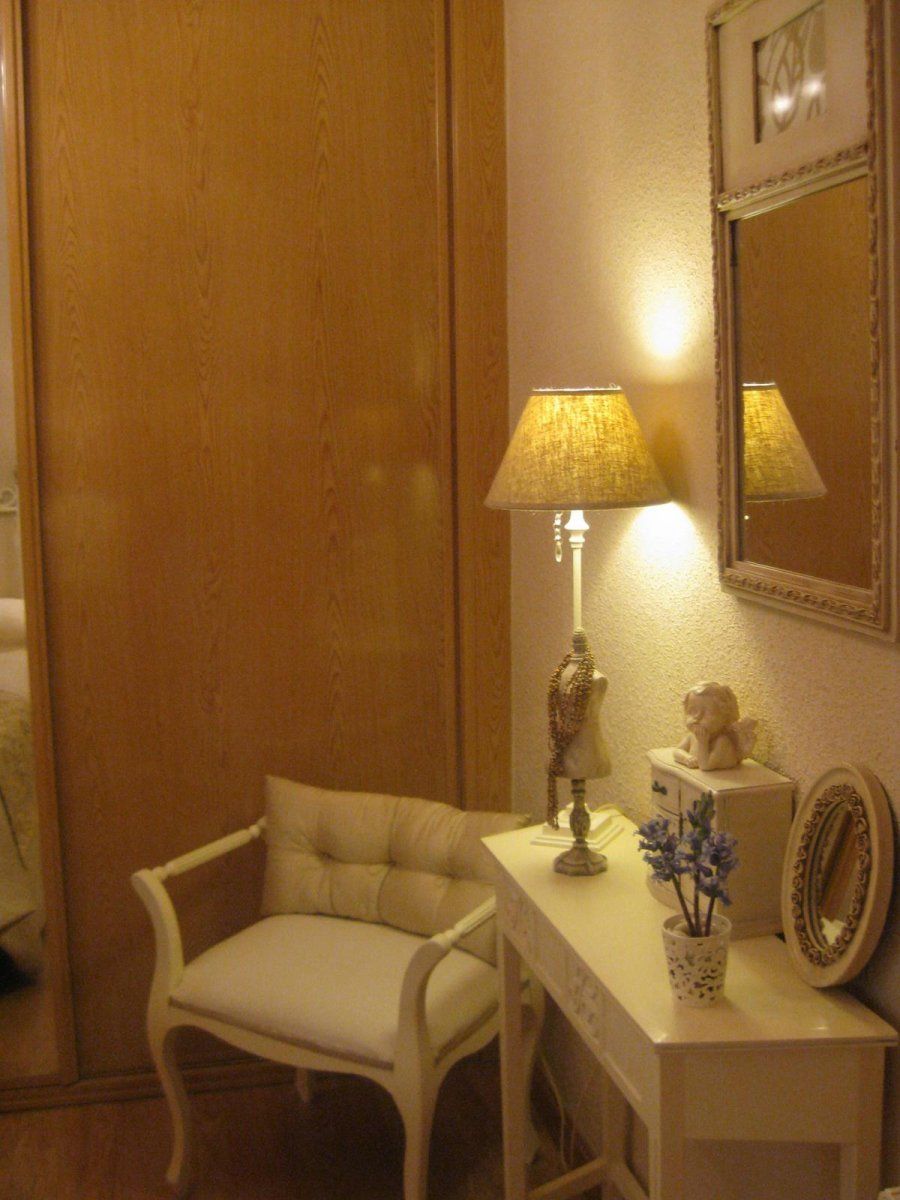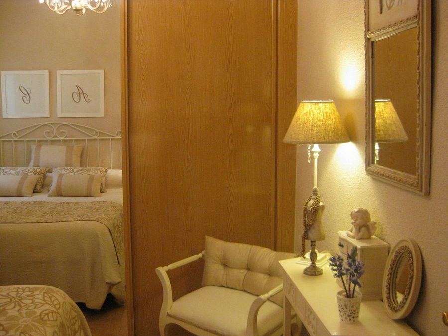 Dos iniciales que antes pertenecían a sendos cojines, realizados con el lino sobrante de las cortinas, fueron convertidas en los cuadros que vigilan la cama. «El beso» de Klimt es el elemento de ruptura dentro de la habitación del descanso. La luminaria del techo, el espejo y la mesita blanca son de Borgia Conty. Sobre esta última vemos la misma lámpara con pantalla de rafia de la mesilla de noche.
