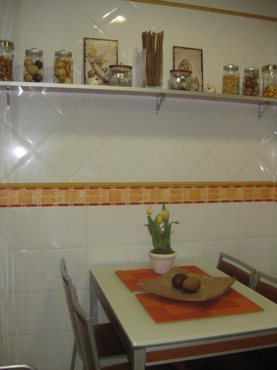En los fogones predomina la calidez de una madera de dos tonos claros que contrastan en frentes y encimera, esta última luciendo accesorios de Musgo. La cenefa naranja y roja que rompe el alicatado blanco y cambia su orientación en la colocación anima la cocina, al igual que las sillas y la mesa de acero y cristal al ácido de Cancio. El estor paqueto de motivos frutales fue confeccionado por Carmen.