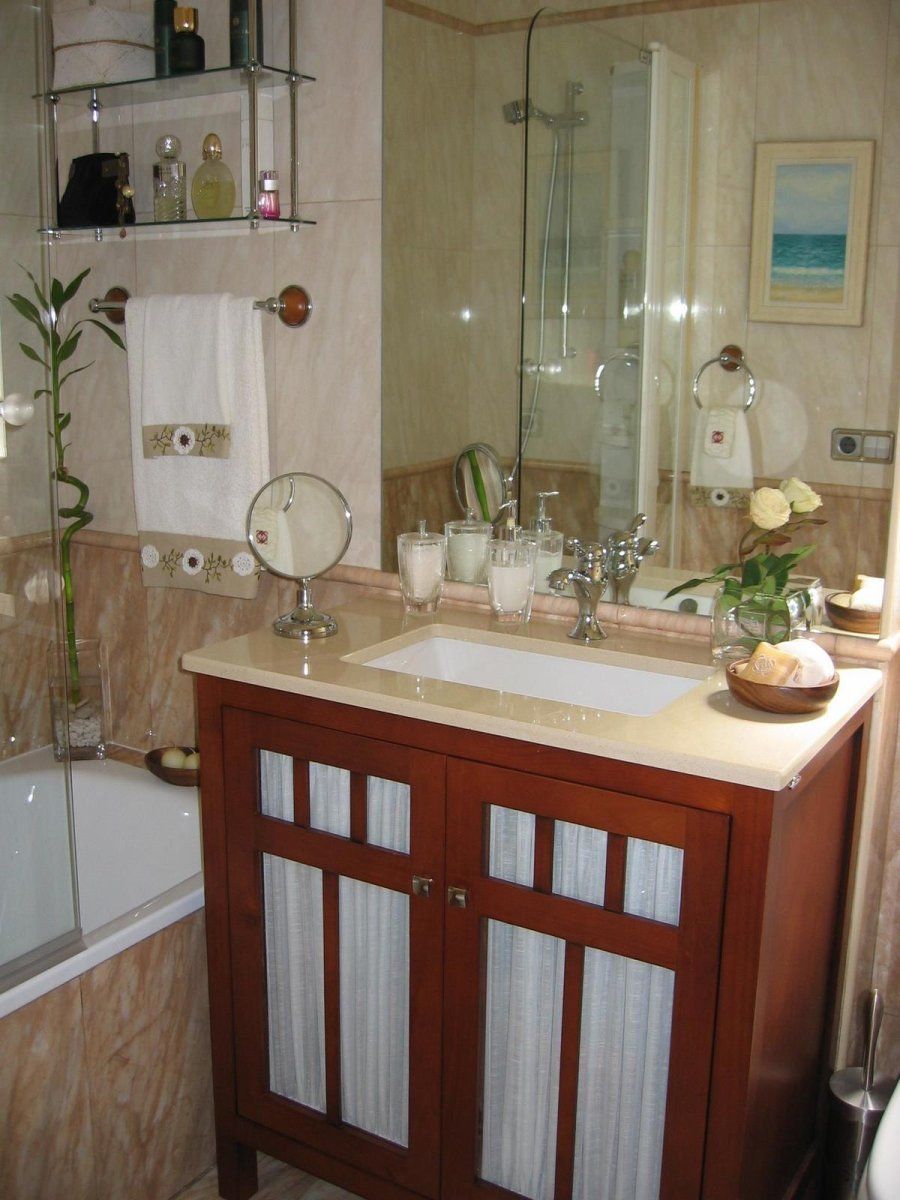 Las piezas textiles que surgen de los toalleros no fueron elegidas al azar. Al igual que el revestimiento del cuarto de baño, que fluye del beige al tostado, las toallas blancas están rematadas por dobladillos de color café con flores bordadas, perpetuando el ansiado equilibrio que Carmen quiso obtener desde que comenzaron las reformas. Advertimos la presencia de un jarrón con piedrecitas y bambú.