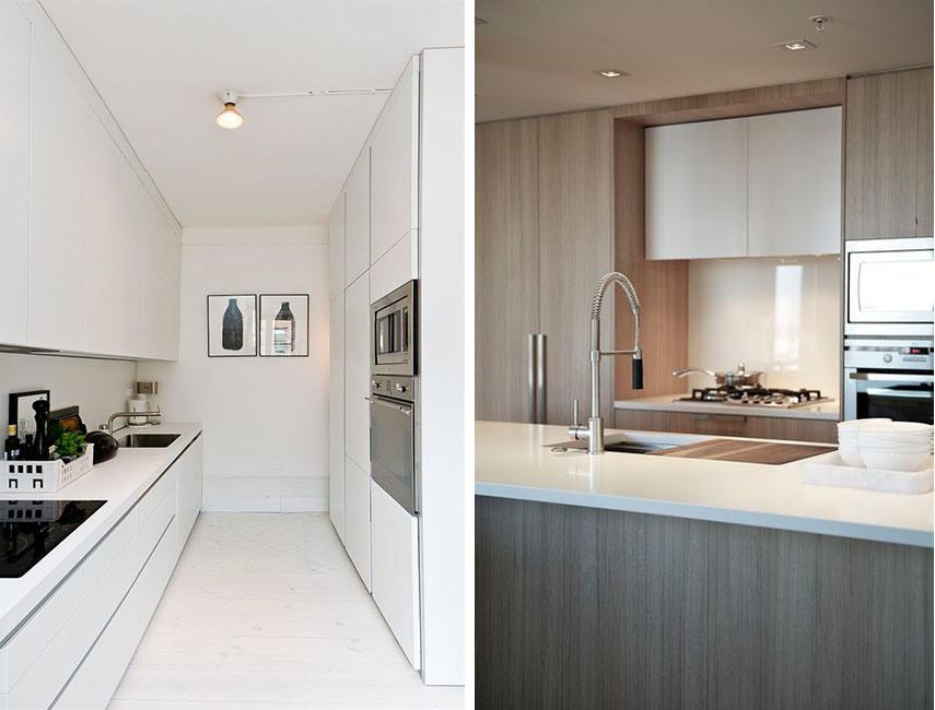 Intentad disponer del máximo trozo de encimera posible, para ello es recomendable -si se puede- dividir la zona de trabajo en dos. Por una parte la zona de aguas donde colocaremos el fregadero y a continuación el lavavajillas para aprovechar desagües y tomas de agua, y por otra la zona de cocción donde colocaremos los fuegos (vitrocerámica, inducción o gas) y lo más cerca posible, el horno, microondas y frigorífico por comodidad a la hora de cocinar.