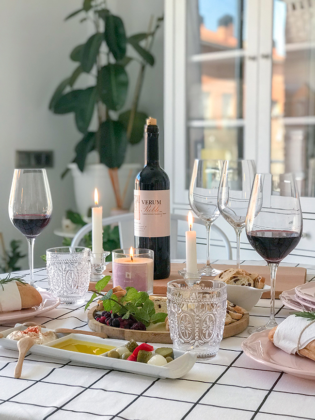 Ahora, sobre la decoración, lo importante es buscar detalles para mimar y lograr que los invitados se sientan especiales. Con el fin de lograr ese objetivo y explorando la web de Bodegas Verum, nos encontramos con sus velas con aroma a vinos, asi que no lo pensamos dos veces y decidimos incluirlas en la decoración de la mesa, porque son perfectas para una cena o para ambientar la casa. Sin embargo, no todo tiene que ser tan elaborado, también puedes optar por algún recurso sencillo, cómo hacerle un nudo a la servilleta sobre el plato, una idea genial que podéis recordad en este post.