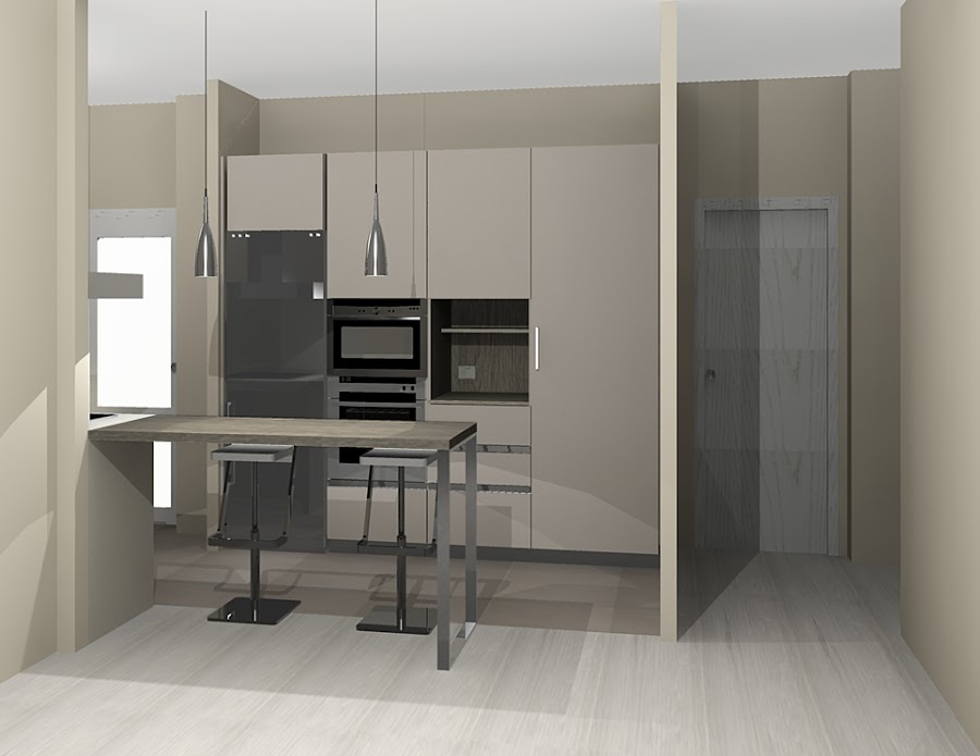 El acabado para los bajos es el tono cachemir. La altura y capacidad de dichos muebles es de 80cms, y los tiradores son con perfil gola en aluminio mate, y quedan integrados en el módulo de cocina.