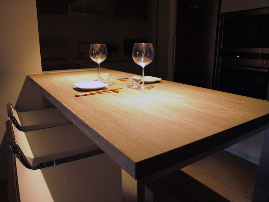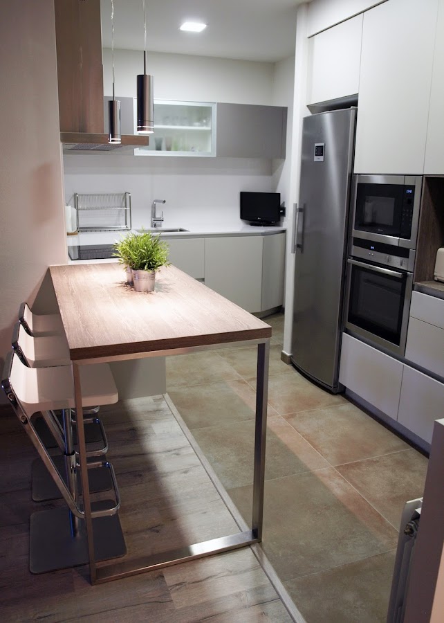 Para integrar la cocina al salón-comedor y a la vez dividir los dos espacios, se colocó una barra de gran resistencia, modelo Roble Tabaco y 4cms de grosor, con estructura de acero inoxidable.
