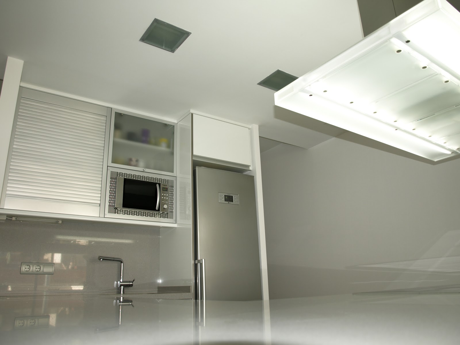 Las puertas y cajones se realizaron con tirador uñero aluminio mate, zócalo de aluminio.Los dos bajos atracados se completaron con un accesorio riñonero que permite la extracción total para una mayor accesibilidad al interior del mueble.
