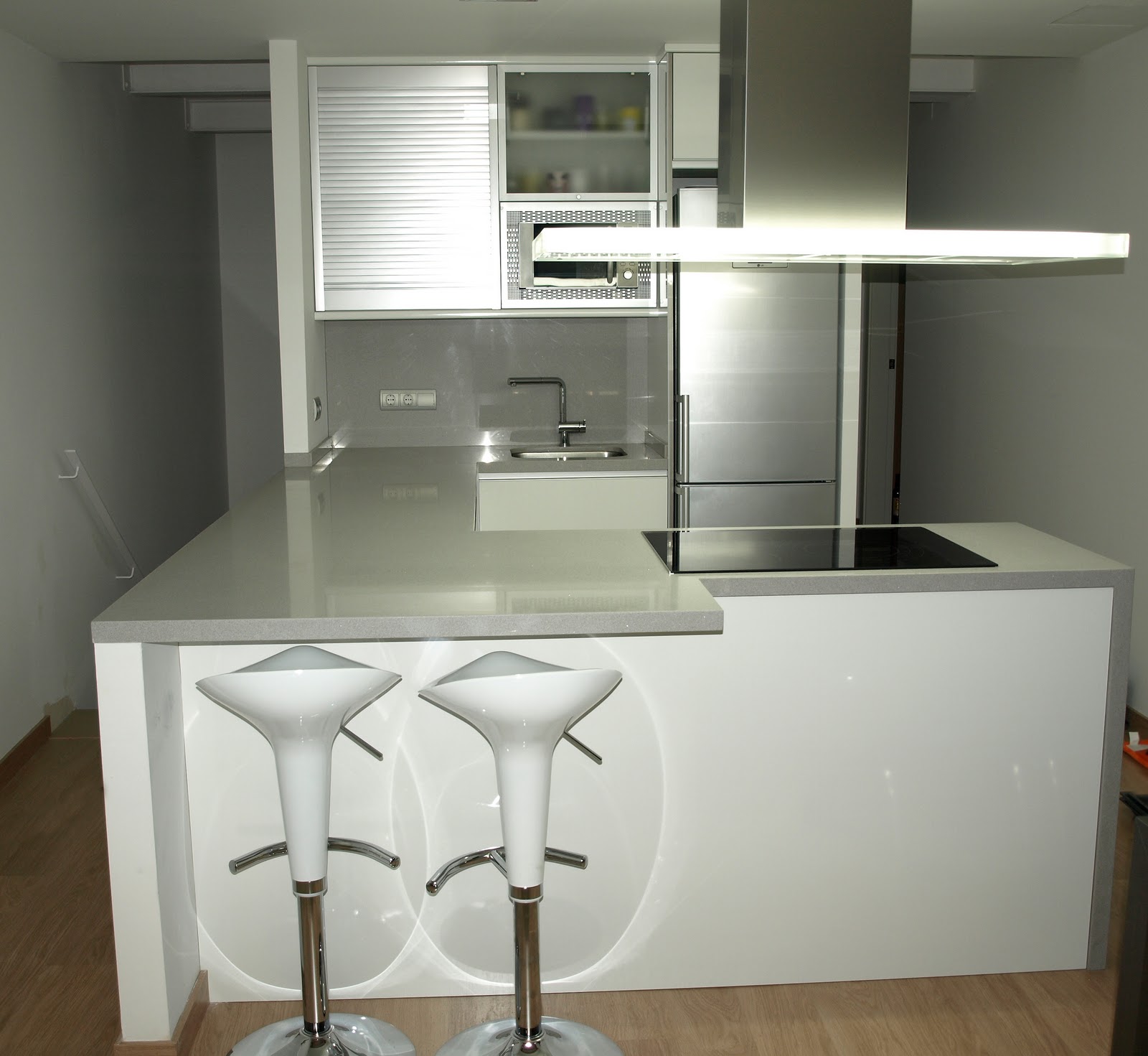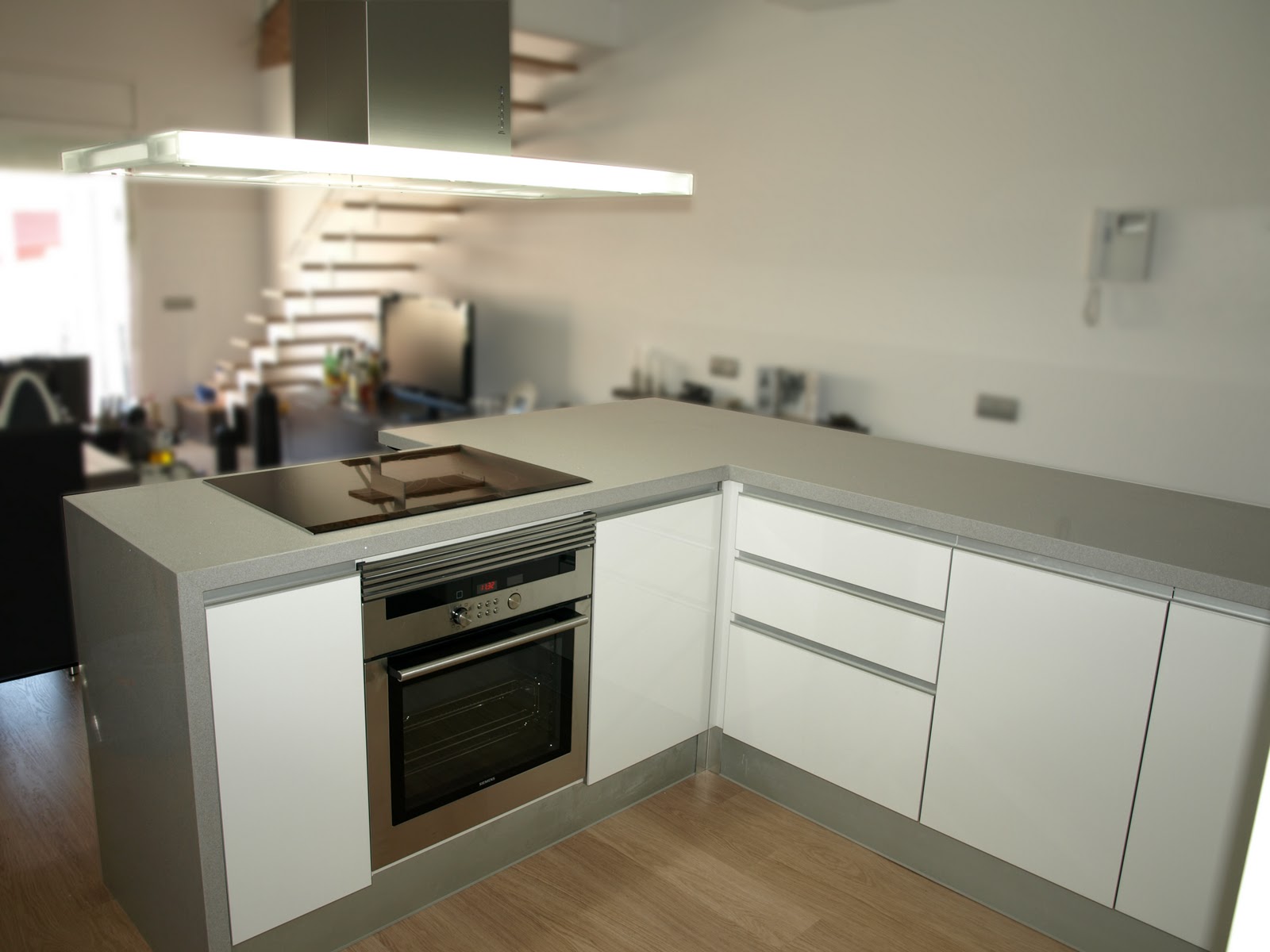 La encimera se realizó en Silestone color aluminio nube con canto de 4 sin junta bisel. El lateral derecho se hizo llegar al suelo para un acabado más compacto.