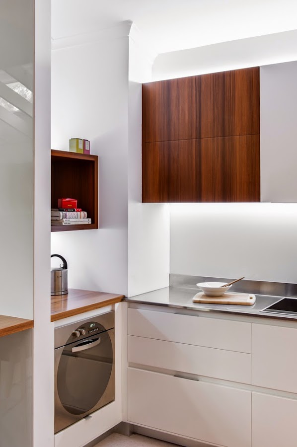 El diseño está compuesto por una distribución en L, con el fregadero y lavavajillas debajo de la ventana, placa de cocción a su izquierda con campana integrada y un par de muebles altos. El antiguo hueco del frigorífico, está ahora ocupado por una cómoda zona con lo necesario para preparar el desayuno, pequeños electrodomésticos y el horno. La iluminación por leds cobra mucha importancia en esos lugares de sombras y hace que el trabajo en ellos sea más agradable.