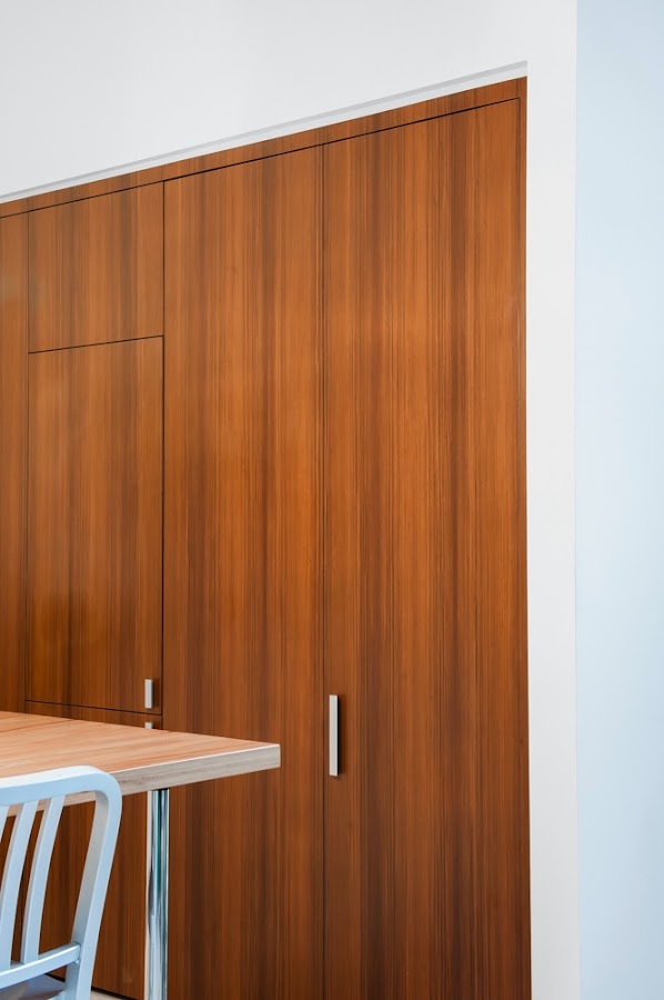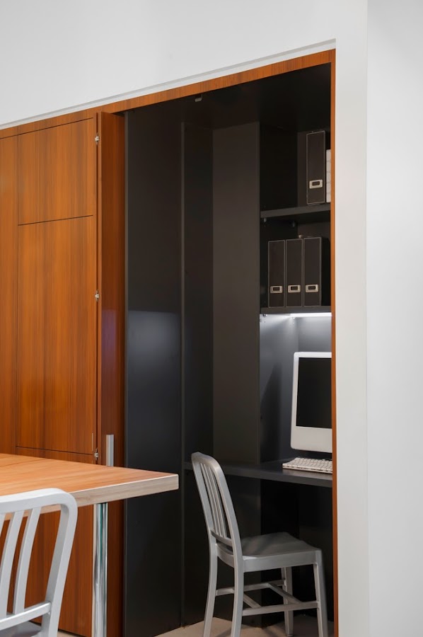 Enfrente, la pared con puertas de madera esconde desde una zona con lavadora y un pequeño lavabo, el frigorífico integrado y una pequeña y práctica mini oficina, con puertas plegables y escamoteables para que no impidan la circulación alrededor. Un ejemplo de armonía y funcionalidad.