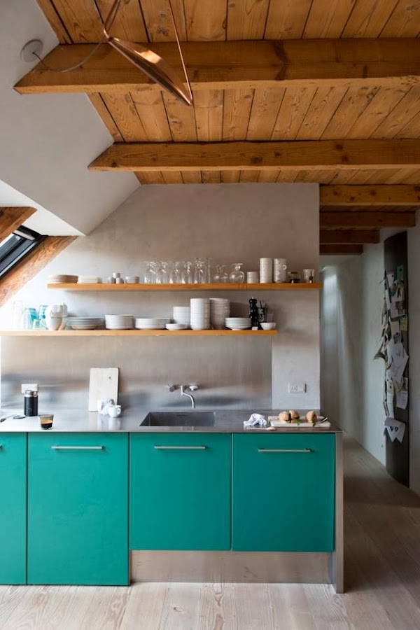 La arquitectura forma parte de la decoración del espacio, haciendo que la inclinación del techo sea un elemento más en el diseño de la cocina.