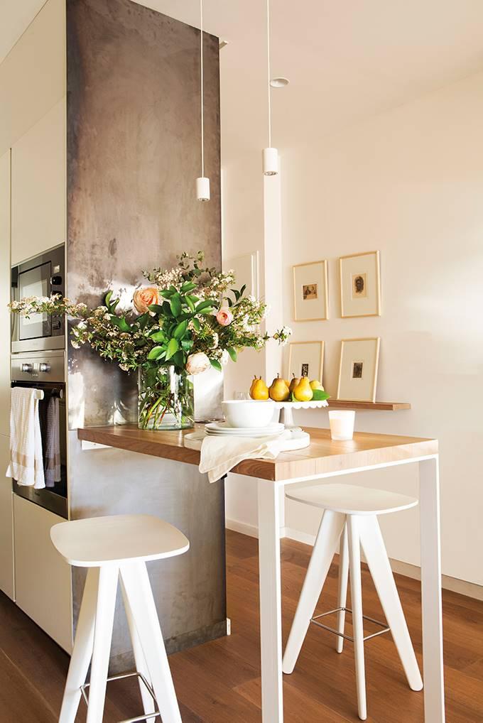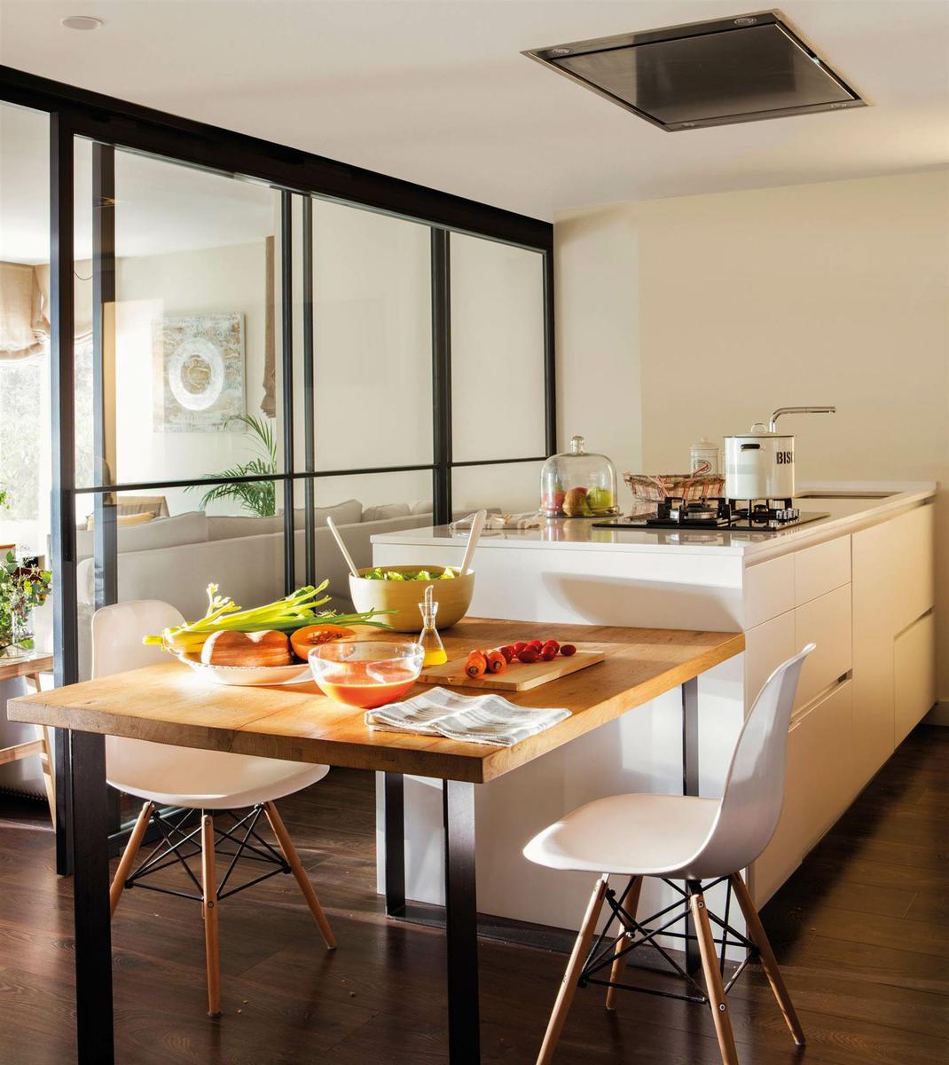 Las islas de cocina aportan una superficie extra, no solo cuando estamos cocinando, sino que nos pueden proporcionar espacio de almacenaje con armarios, cajones o simples estantes. Nos permiten también comer en familia o tomar algo sentados en taburetes o en banquetas altas. Si tu cocina es grande, enhorabuena, no sólo podrás tener una isla con zona de cocción o fregadero, sino que, si lo deseas, podrás añadir una superficie extra a menor altura que sirva como mesa para comer, trabajar o para que nuestros hijos jueguen o hagan sus tareas mientras cocinamos. Y si, en cambio, tu cocina es pequeña, no tienes por qué renunciar a una pequeña isla con espacio de almacenaje y una superficie que puede ser plegable para cuando la necesites.