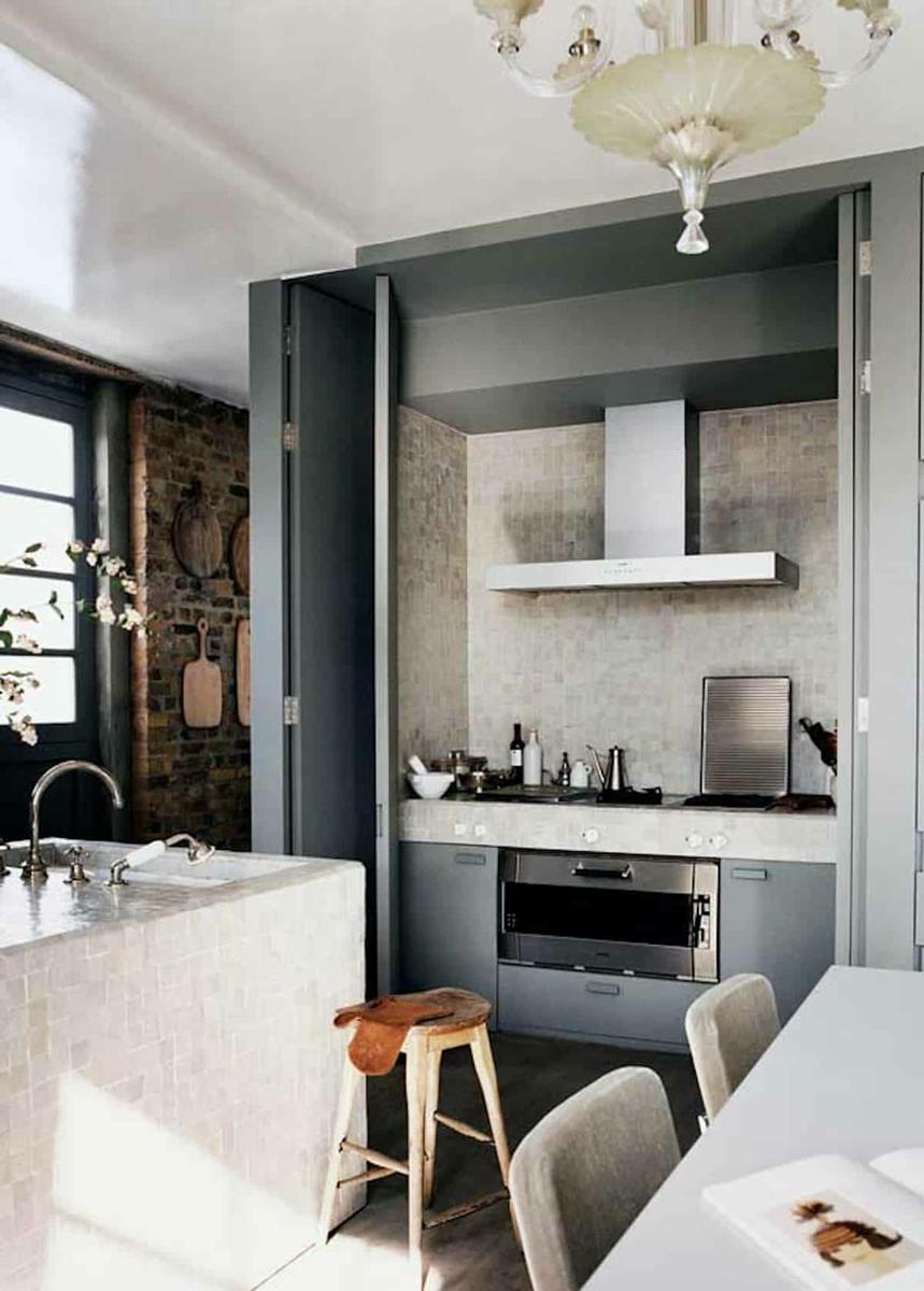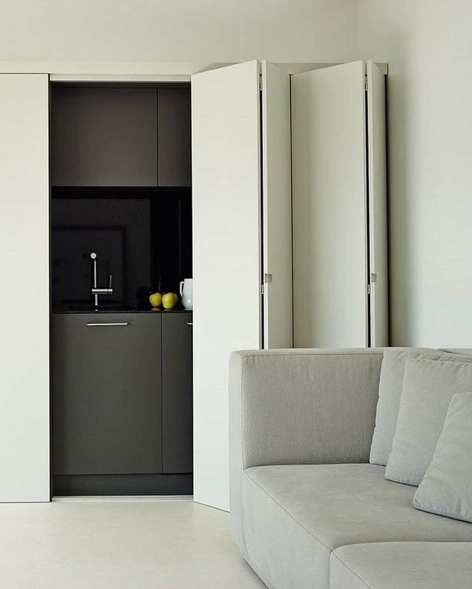 Fuente: pinterest Cuando optamos por una cocina oculta con puertas de acordeón se está consiguiendo la fusión entre la estética y la funcionalidad. De esta manera permite convertir la estancia según las necesidades. Si está oculta el espacio pasa a tener un único propósito, ya sea comedor o salón, mientras que cuando está abierta se mezcla con el ambiente.