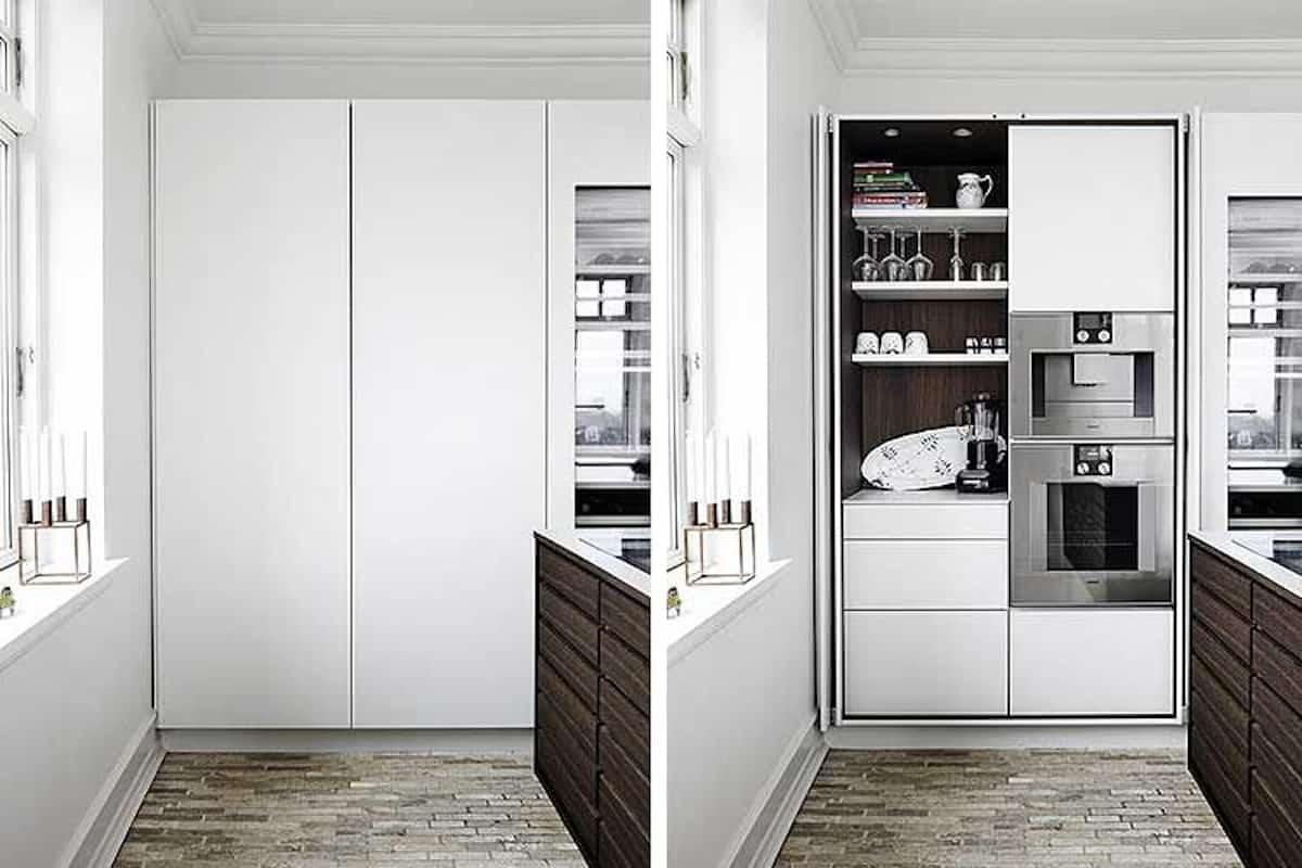 Fuente: pinterest La cocinas ocultas tipo closet son muy prácticas y funcionales. No ocupan espacio debido a su constitución de armario empotrado que va de techo a suelo en una de las paredes de la habitación. Muchas veces resulta difícil reconocer que detrás de puertas puede haber una cocina completa.