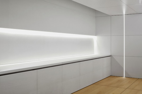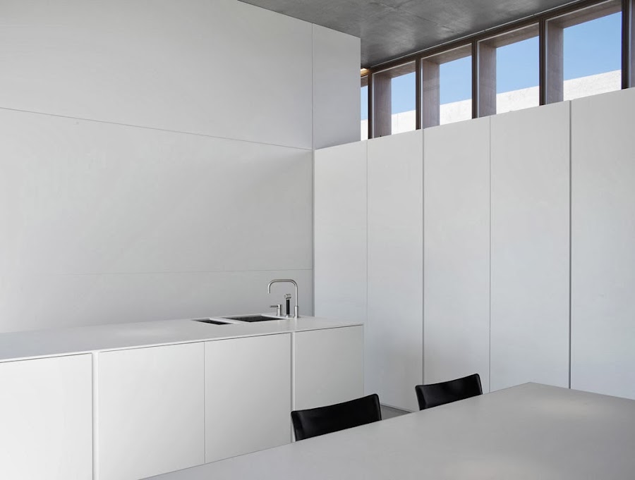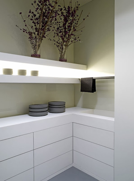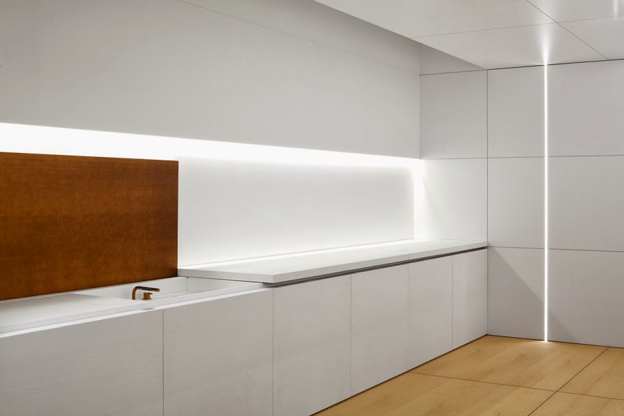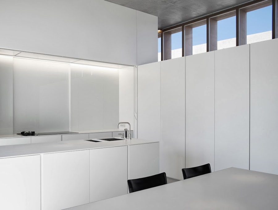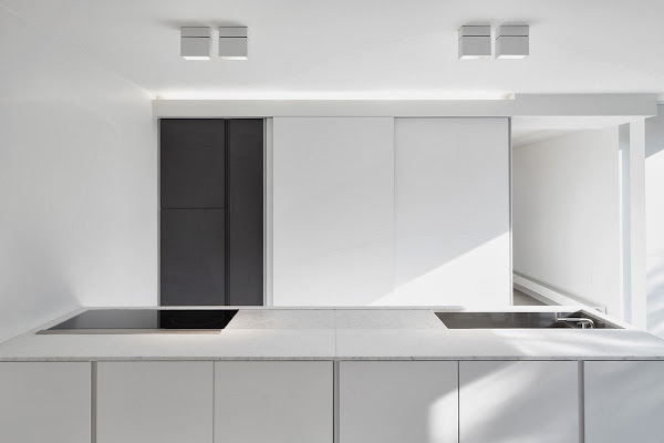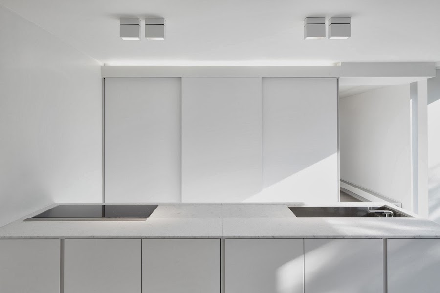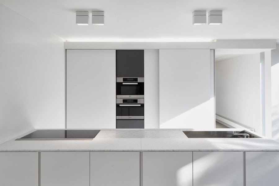 En este caso, la encimera también es necesario descubrirla por sectores para poder hacer uso de ella. Y por supuesto, todos los muebles sin tiradores, que reafirman el minimalismo que pretenden estos estupendos diseños.